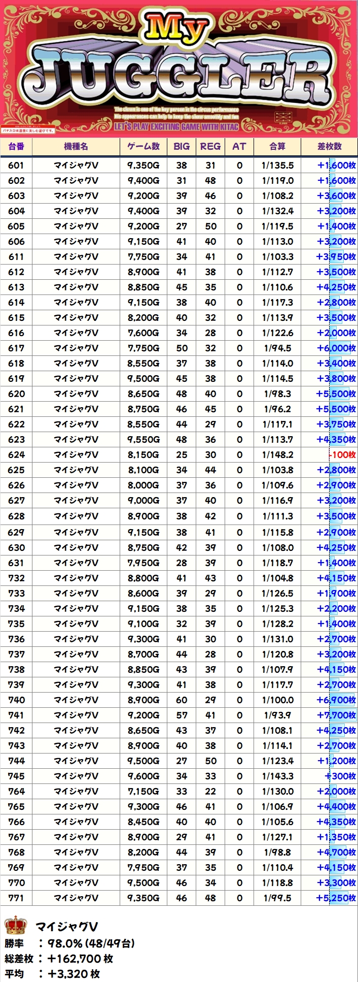 勝率98%(48/49台)と抜群の安定感だったため、2Fのマイジャグは最高の仕掛けだった可能性が極めて高そうです。