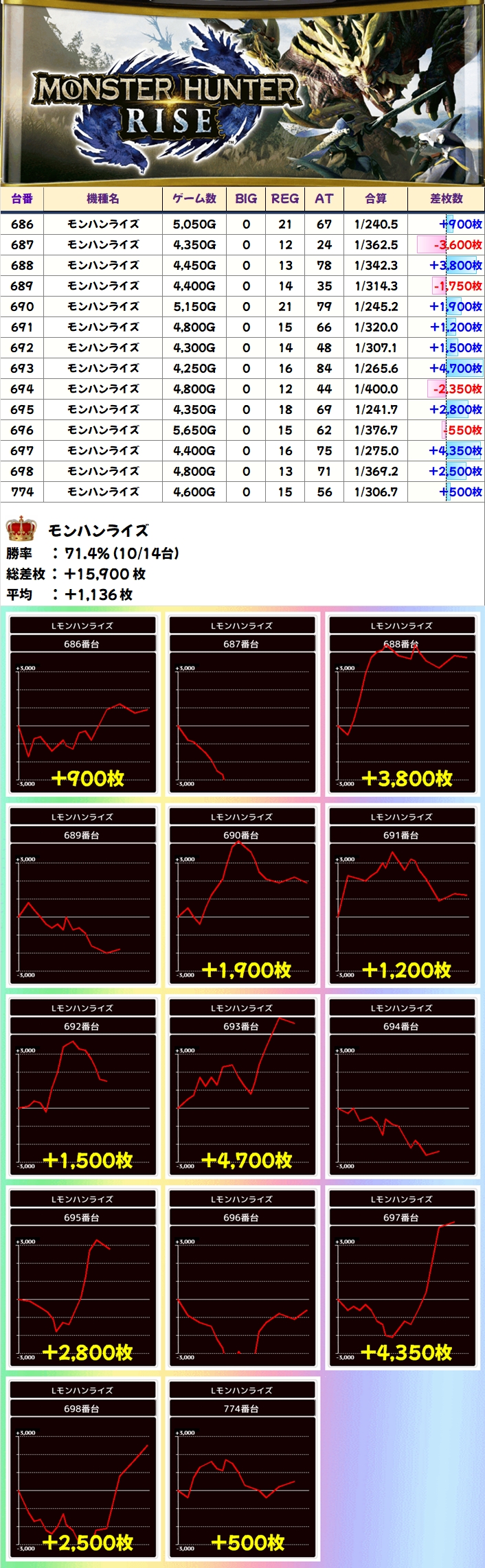 【全台系濃厚】モンハンライズ(10/14台+)→平均+1,136枚