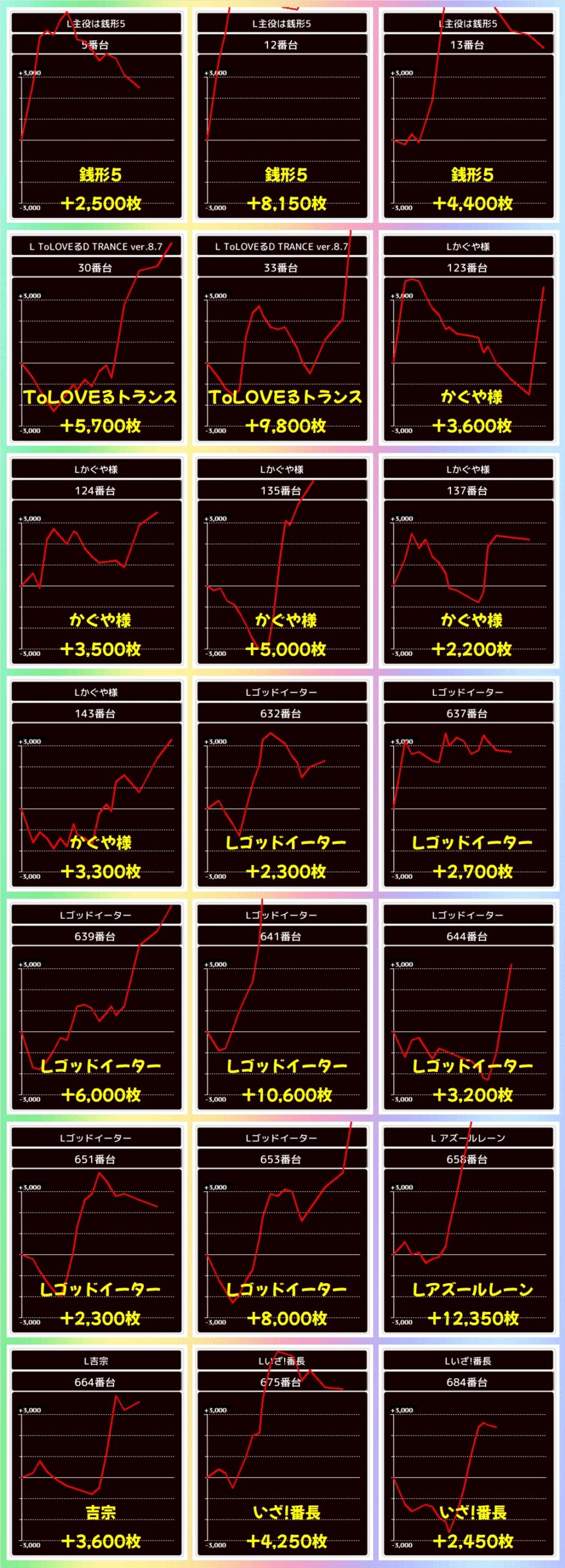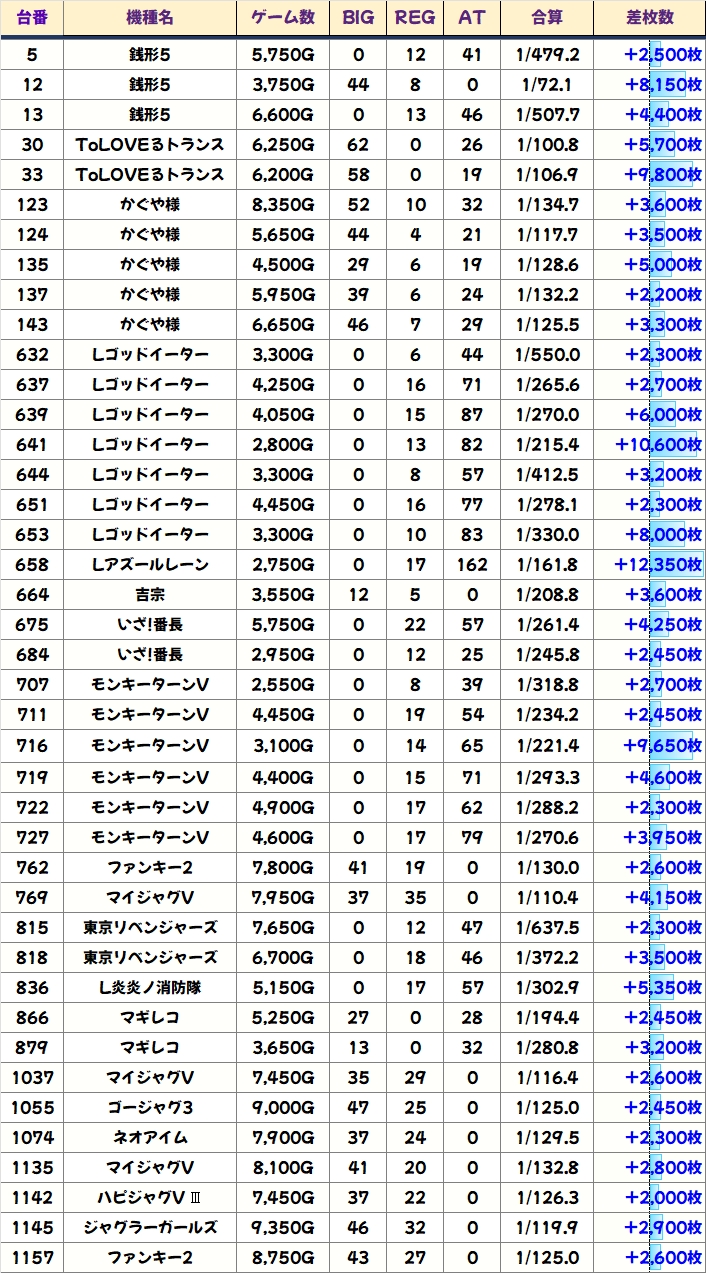 +5000枚オーバーの爆出し台も複数確認でき、ゴッドイーター・アズールレーンからは万枚オーバー台も出現していましたよ!