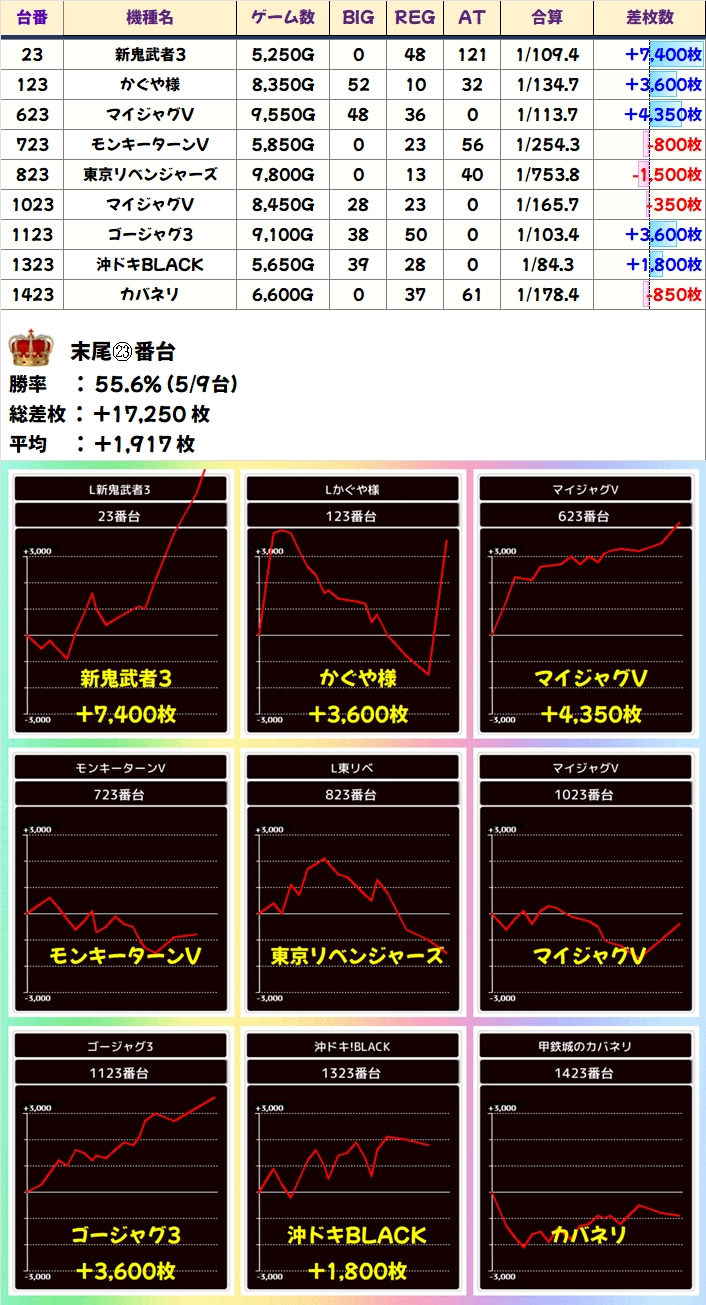 【末尾仕掛け】末尾㉓番台(5/9台+)→平均+1,917枚