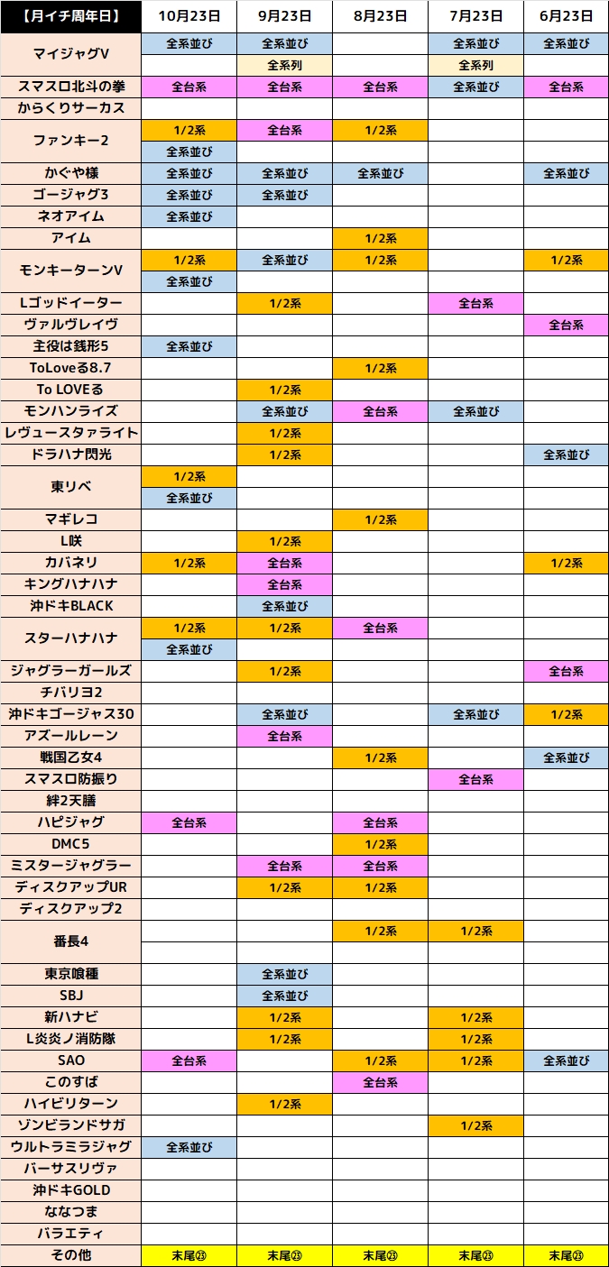 月イチ周年日は多台数機種の全台系を高頻度で確認できているため、来月以降もド派手な全台系に期待できそうですね。