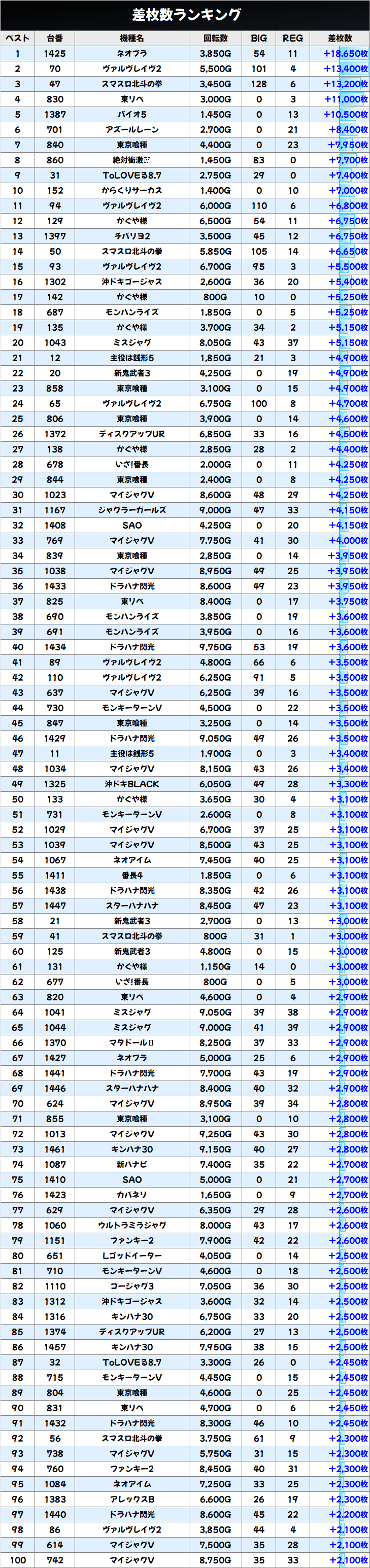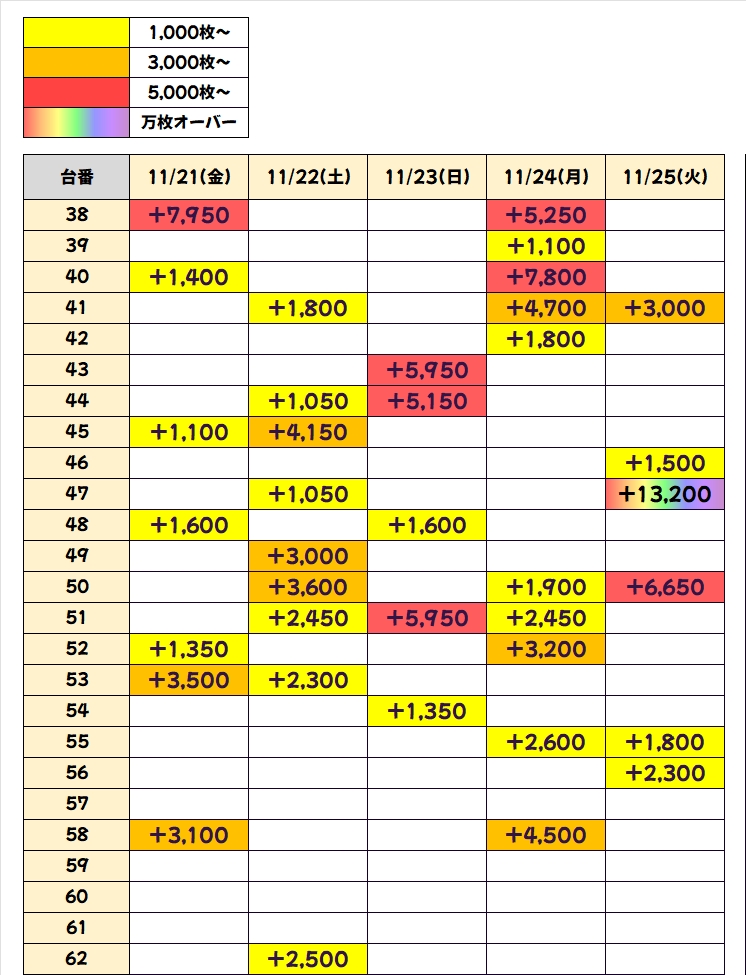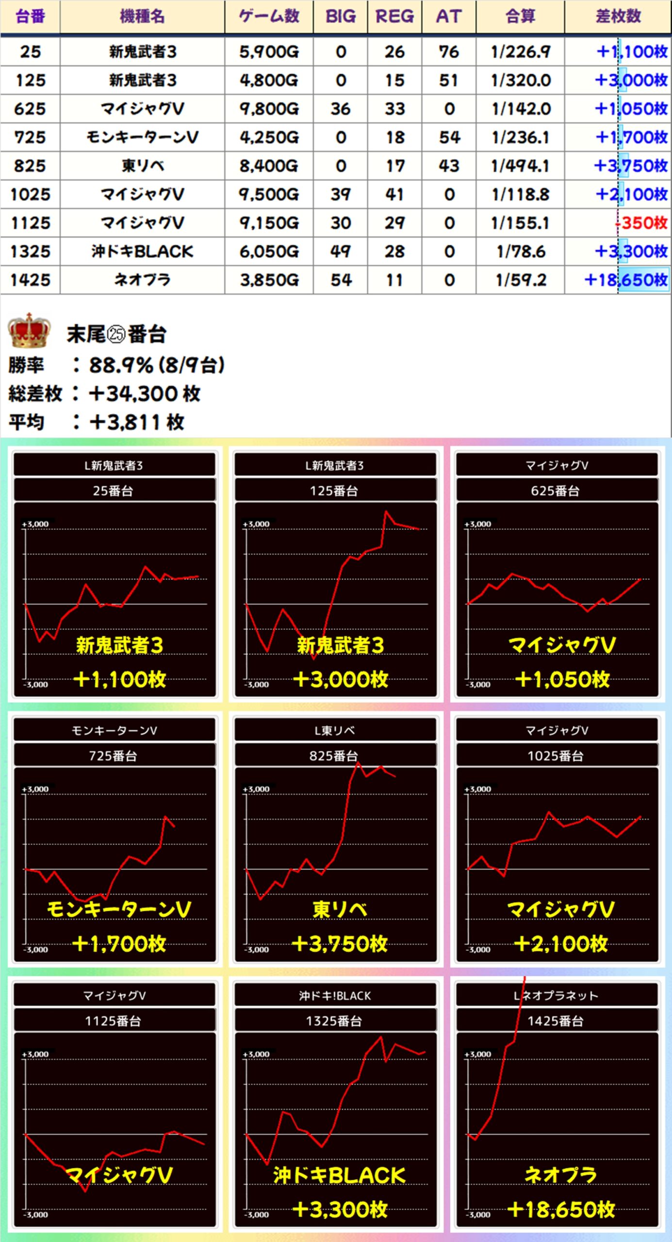毎月21日~27日は日付末尾が強くなる傾向にあり、日付け末尾の末尾㉕番台が全台系濃厚に。ネオプラからは+18650枚のコンプリート濃厚台も飛び出し、平均+3811枚の素晴らしい結果を残すこととなりました。