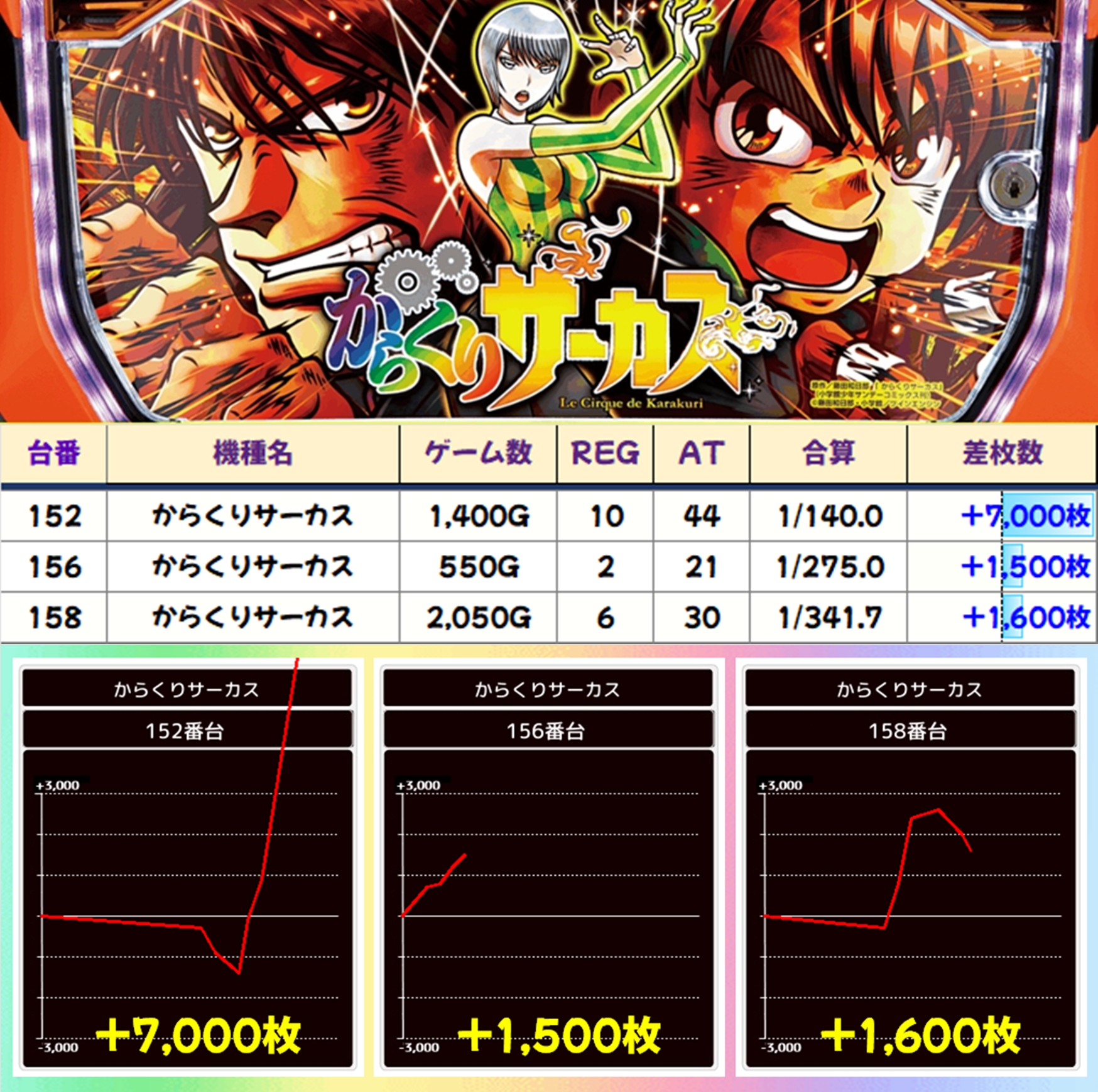 からくりサーカスからは+7000枚の爆発台を確認!その他、+1600枚、+1500枚の出玉もアリ!