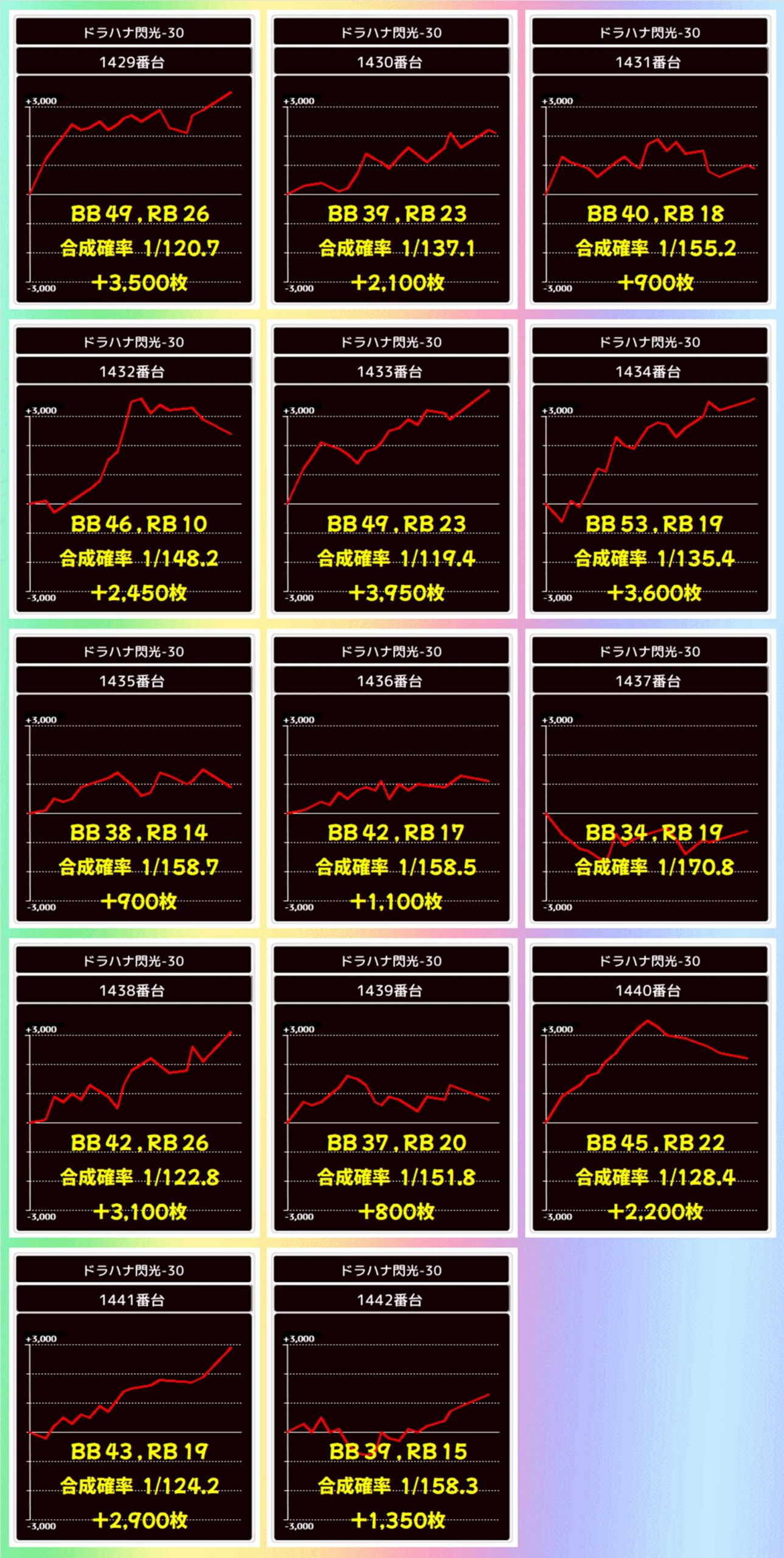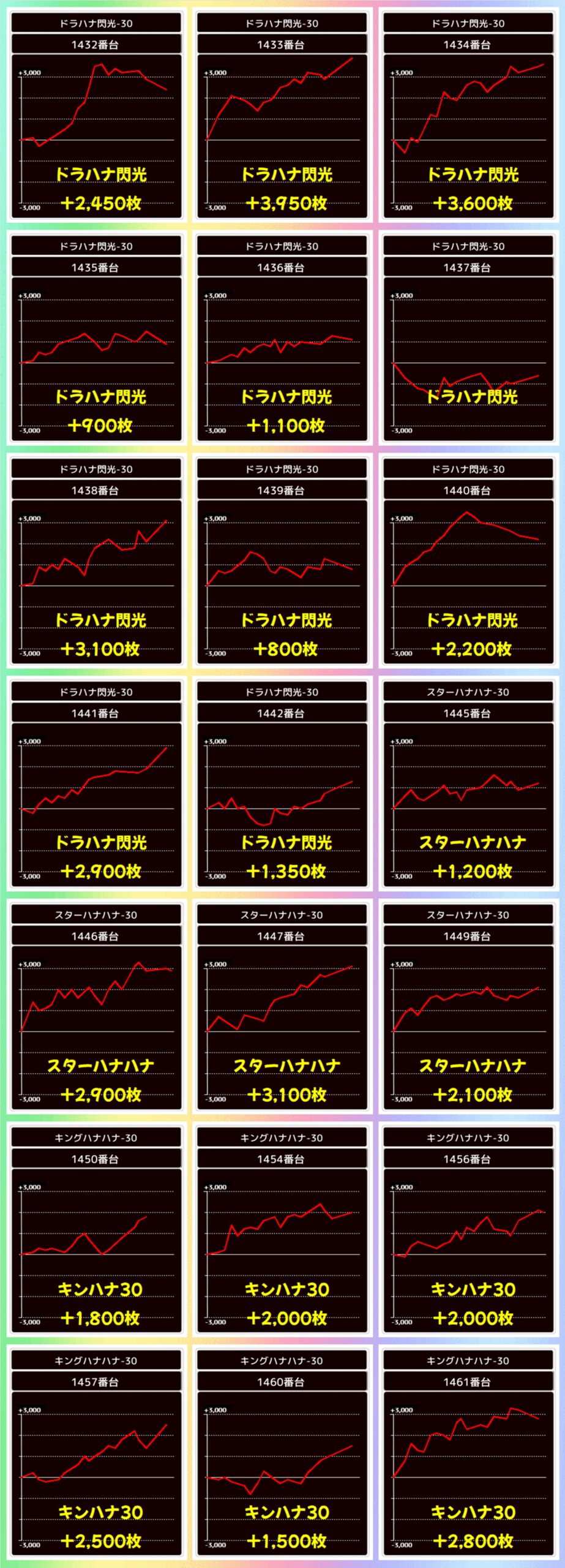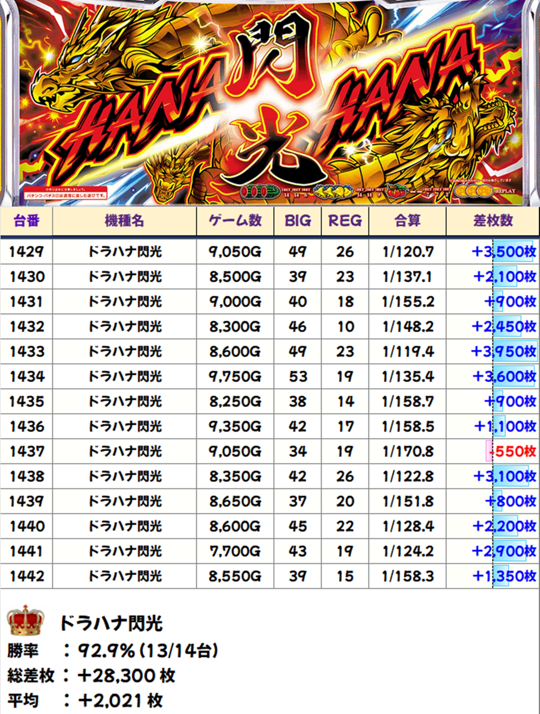 5の日機種でもあり激アツ7days対象の4Fに設置があるドラハナ閃光は全台系濃厚で、平均+2000枚を超える素晴らしい結果となりました。