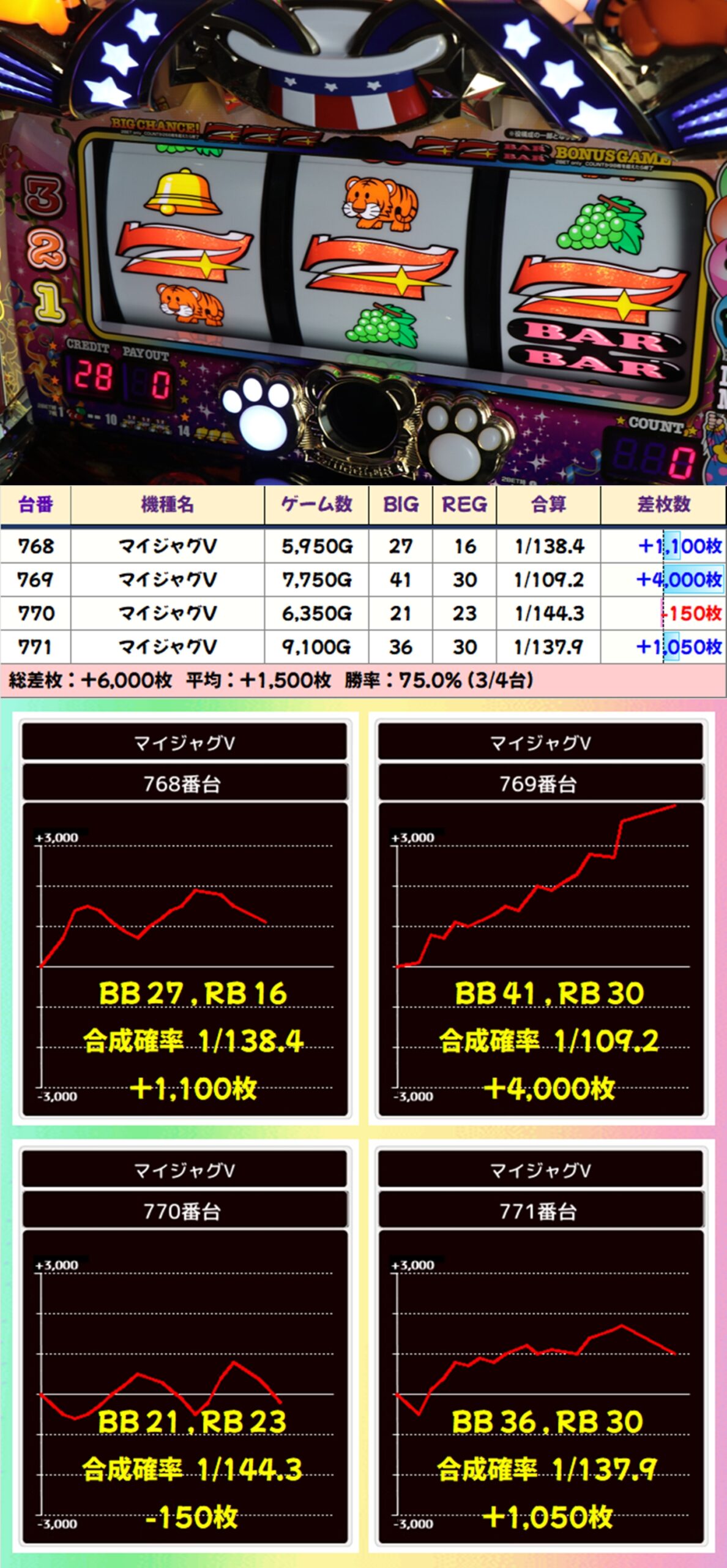 【4台並び】マイジャグV(768-771番台)→平均+1,500枚