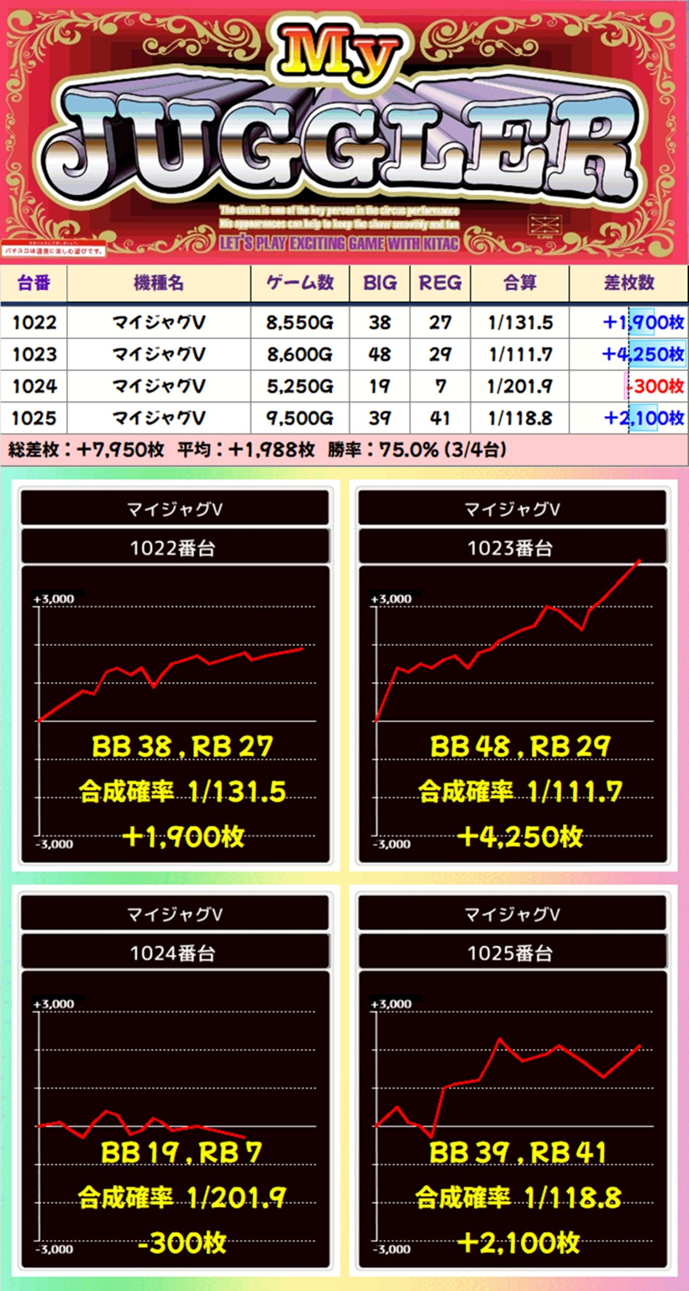 【4台並び】マイジャグV(1022-1025番台)→平均+1,988枚