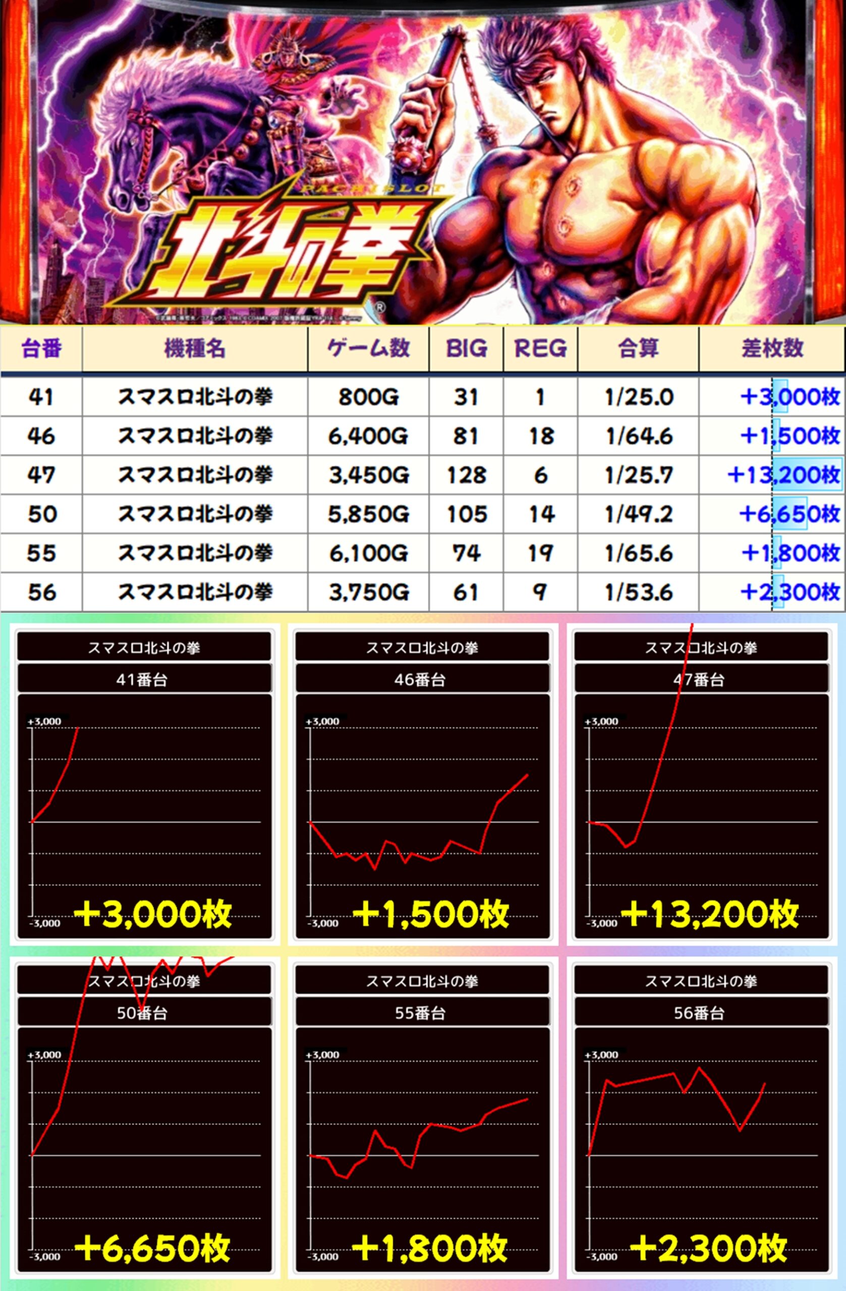 新ポスターが登場しているスマスロ北斗の拳からは+13200枚の万枚オーバーが出現。5日目の今回もお宝台が複数出現しました。