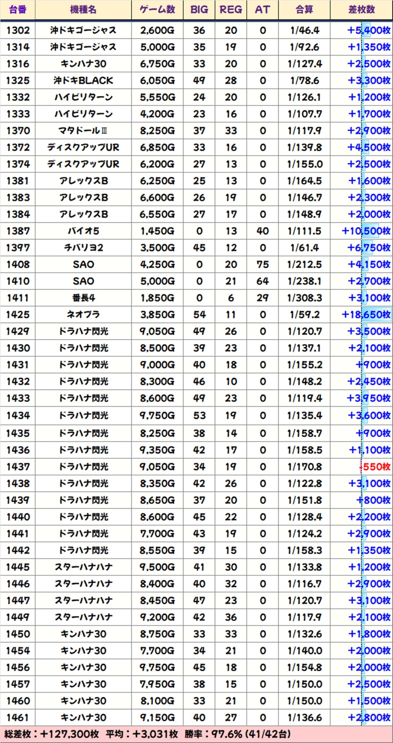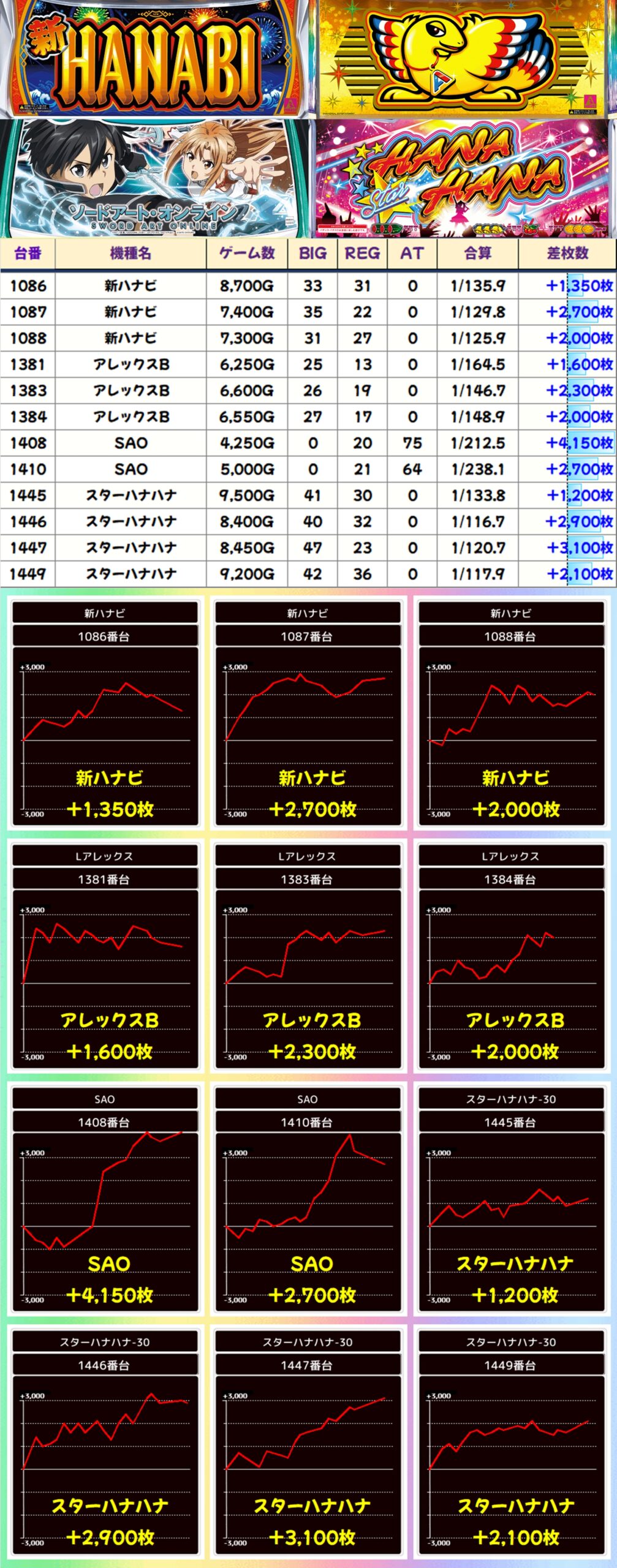 5の日機種のスターハナハナ、Aタイプの新ハナビ、BT機のアレックスBに加えてSAOにも1/2系濃厚の仕掛けが出現。いずれの機種からも優秀な出玉を確認できました。また、4機種ともに合計でもしっかりプラスとなっておりましたね!