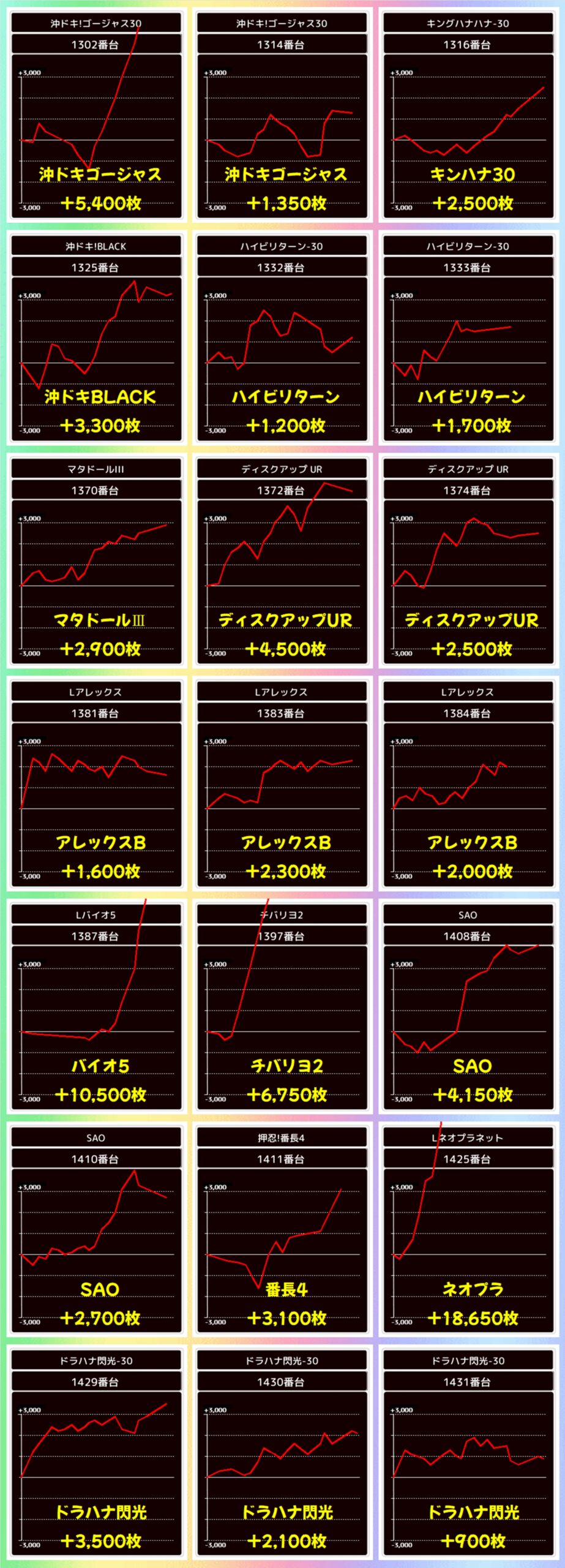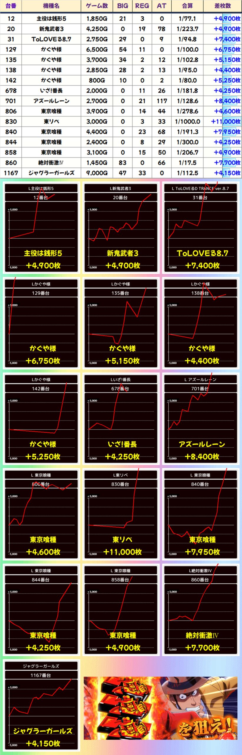 今回も各機種の優秀台(+1000枚超)をピックアップ!