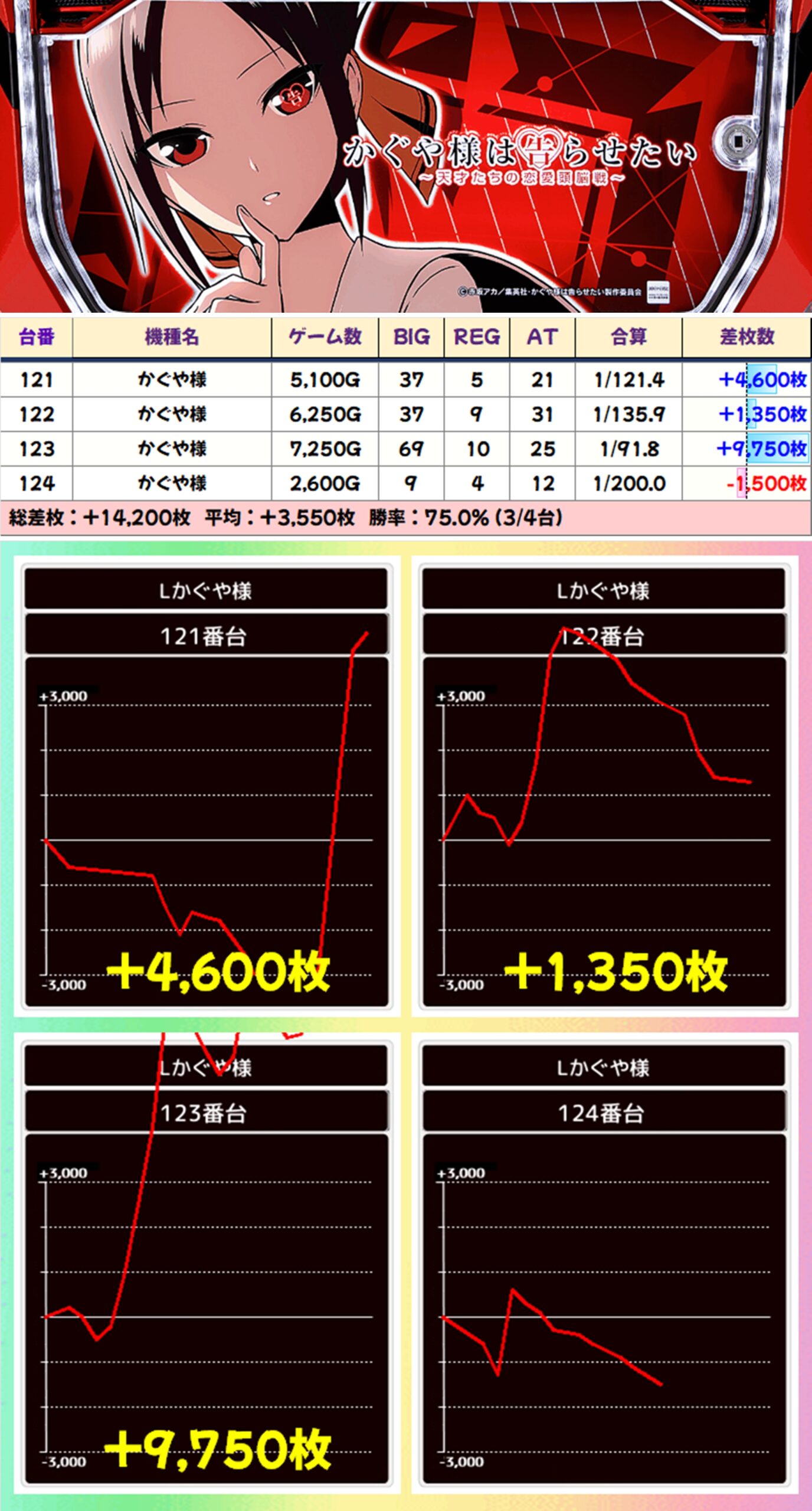 【4台並び】かぐや様(121-124番台)→平均+3,550枚