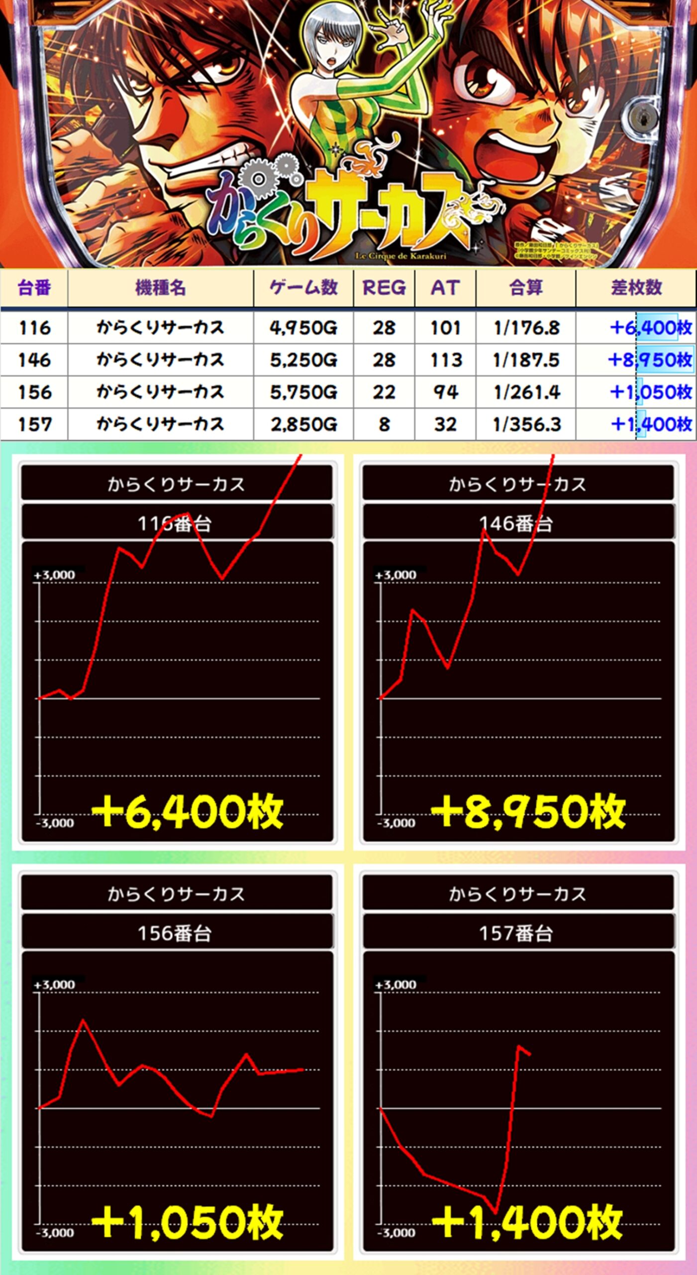 末尾⑥番台は、吉宗から+14150枚の大爆発台が出現し、毎日オススメ機種のからくりサーカスや新ポスター出現中のスマスロ北斗の拳など、多くの機種からお宝台を確認することができました!