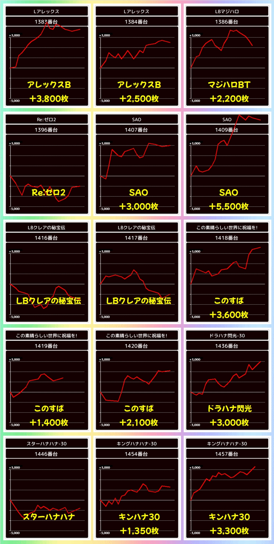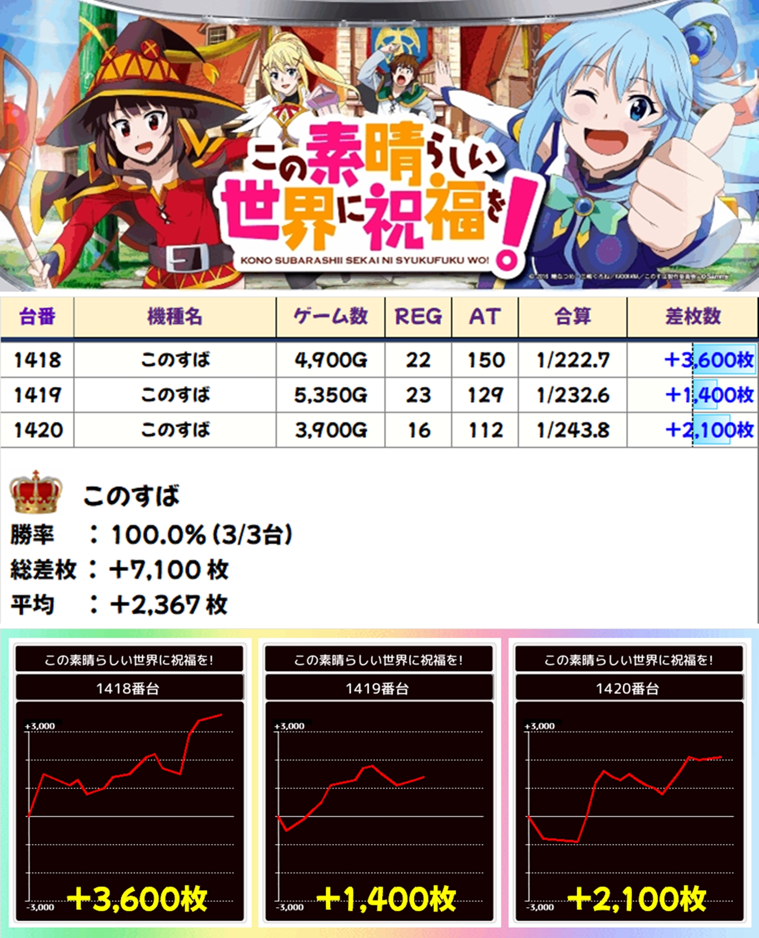 このすばは3台全てがプラス差枚で全台系濃厚に。+3600枚の大量出玉も出現!