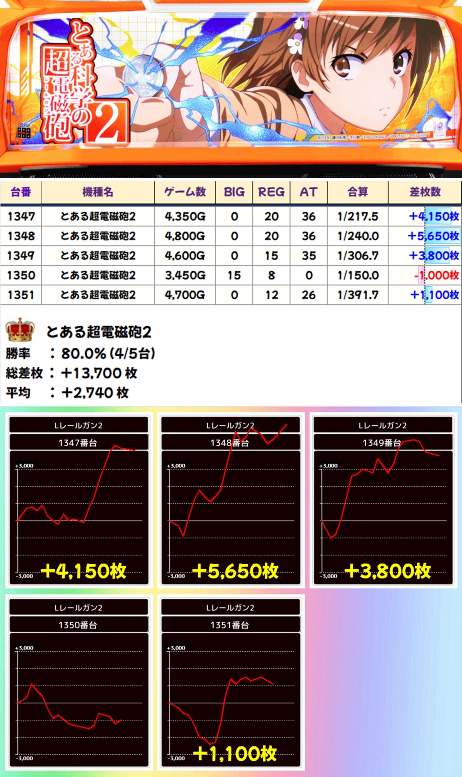 とある超電磁砲2は1台が不発となってしまったものの、+5650枚や+4150枚の大量出玉もアリ!平均では+2740枚の好成績を残しました。