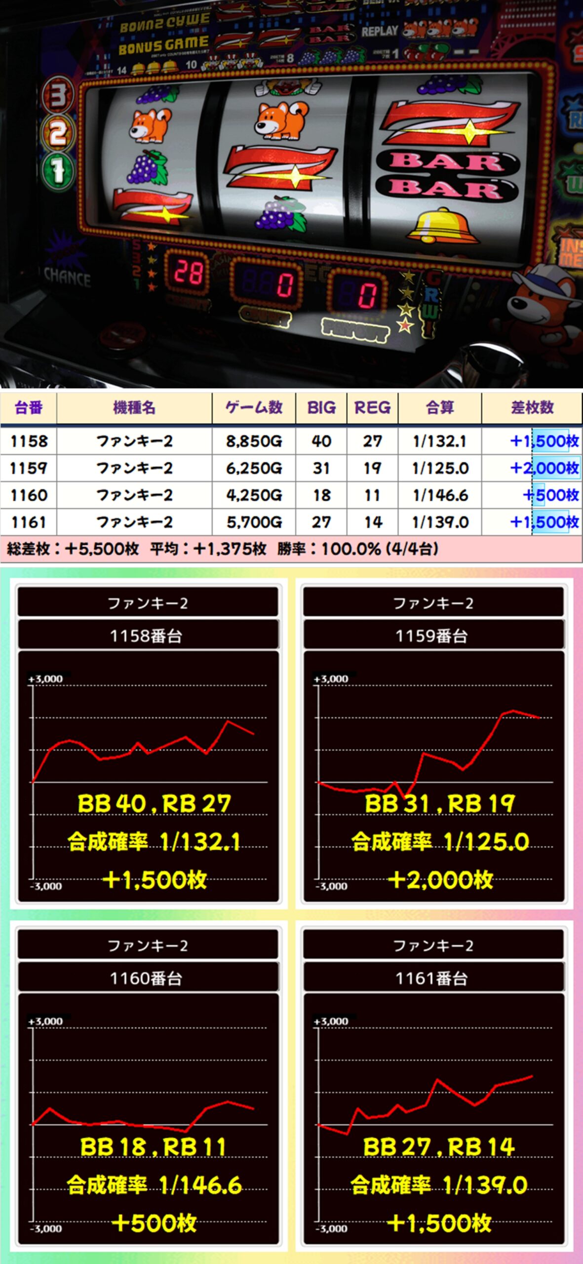【4台並び】ファンキー2(1158-1161番台)→平均+1,375枚