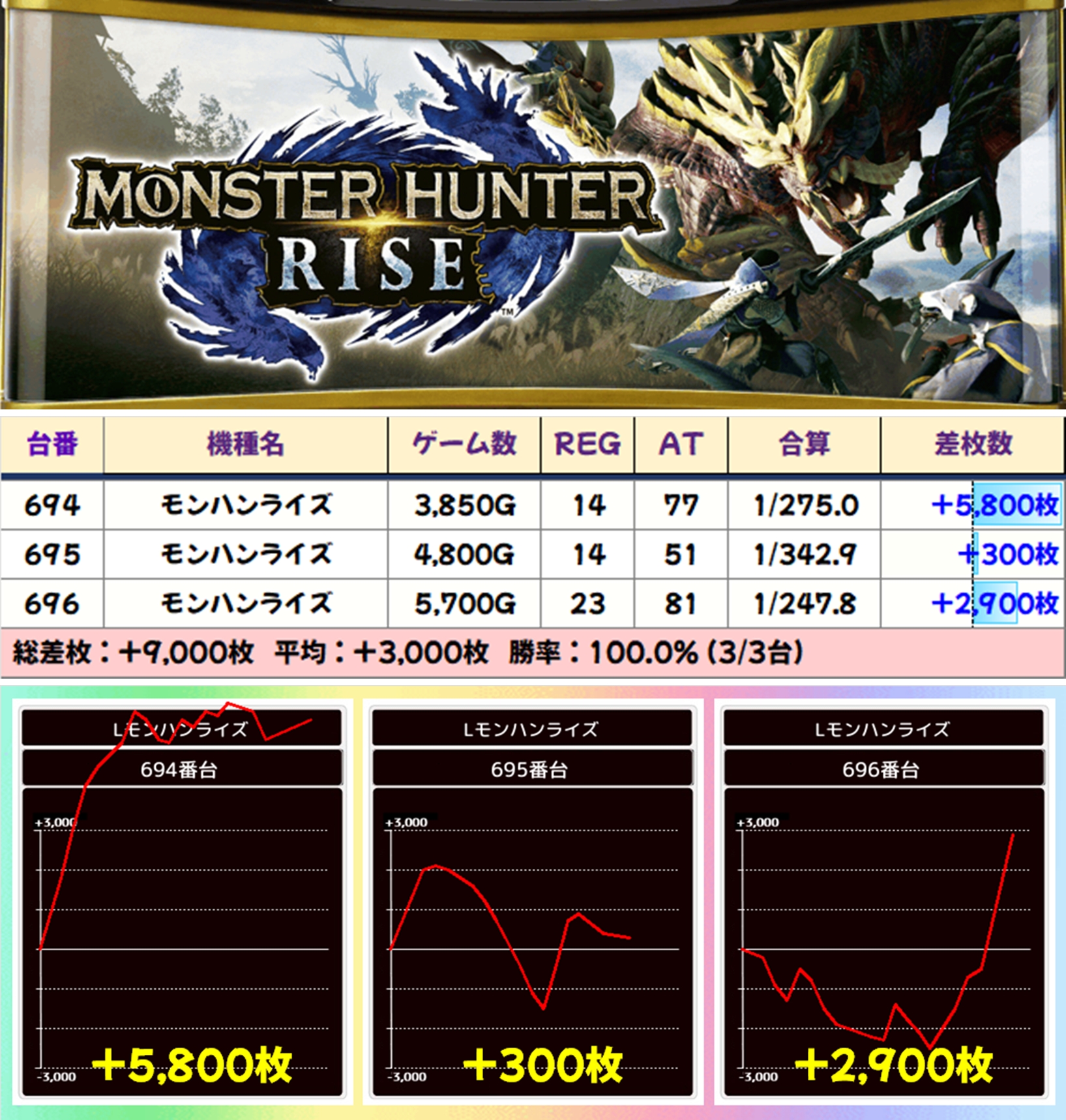 【3台並び】モンハンライズ(694-696番台)→平均+3,000枚