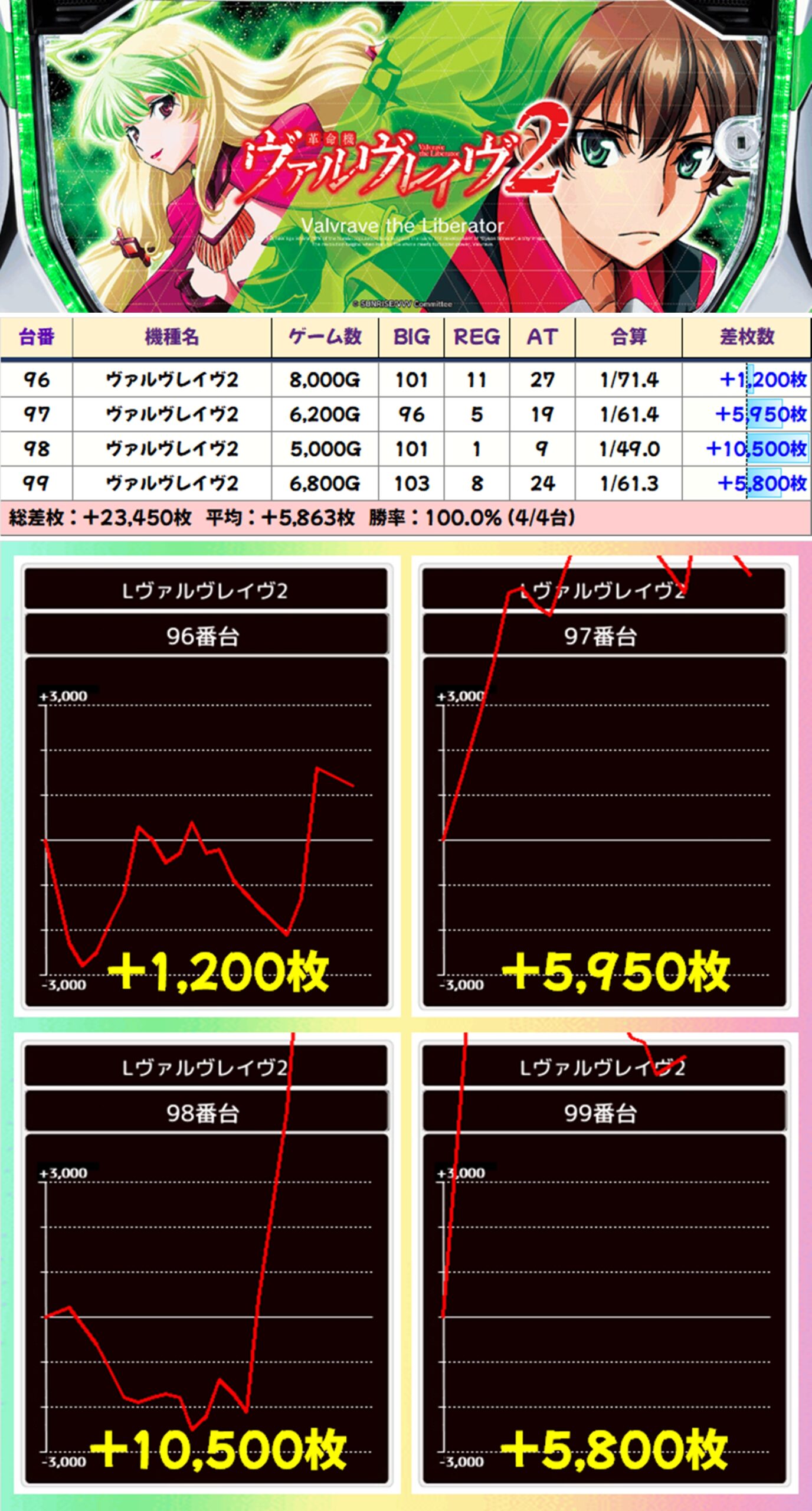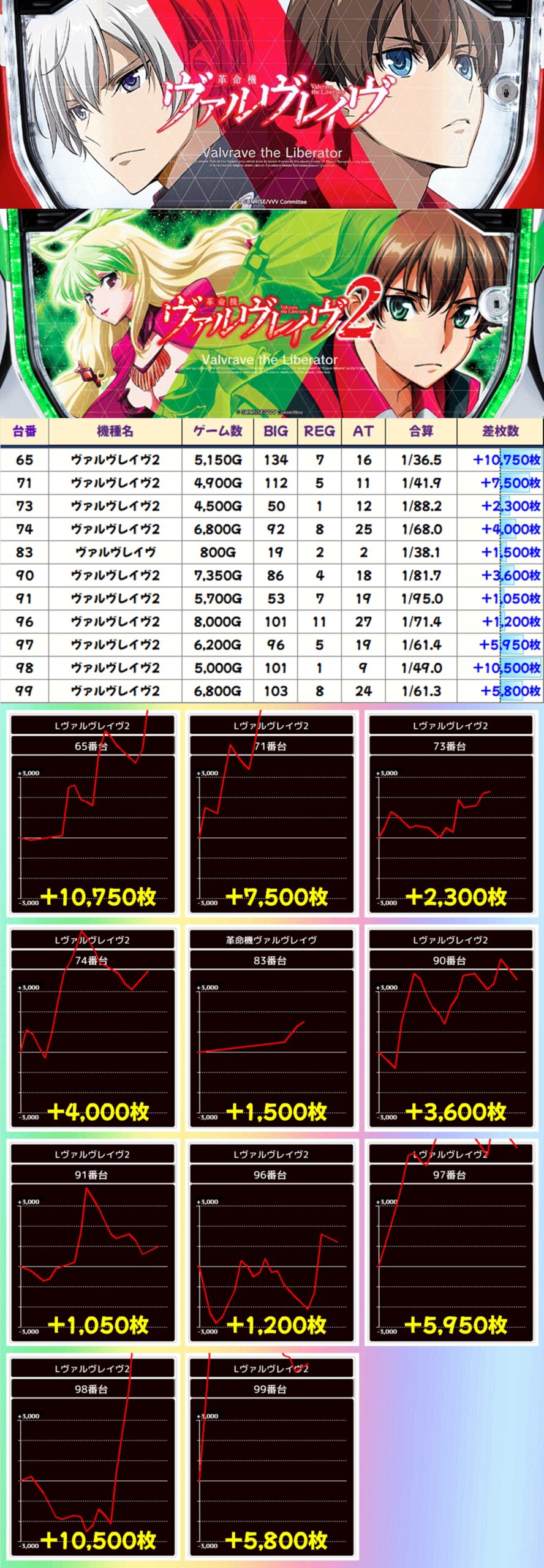 毎日オススメ機種のヴァルヴレイヴ2に4台並びからは+10500枚の万枚オーバーが出現。