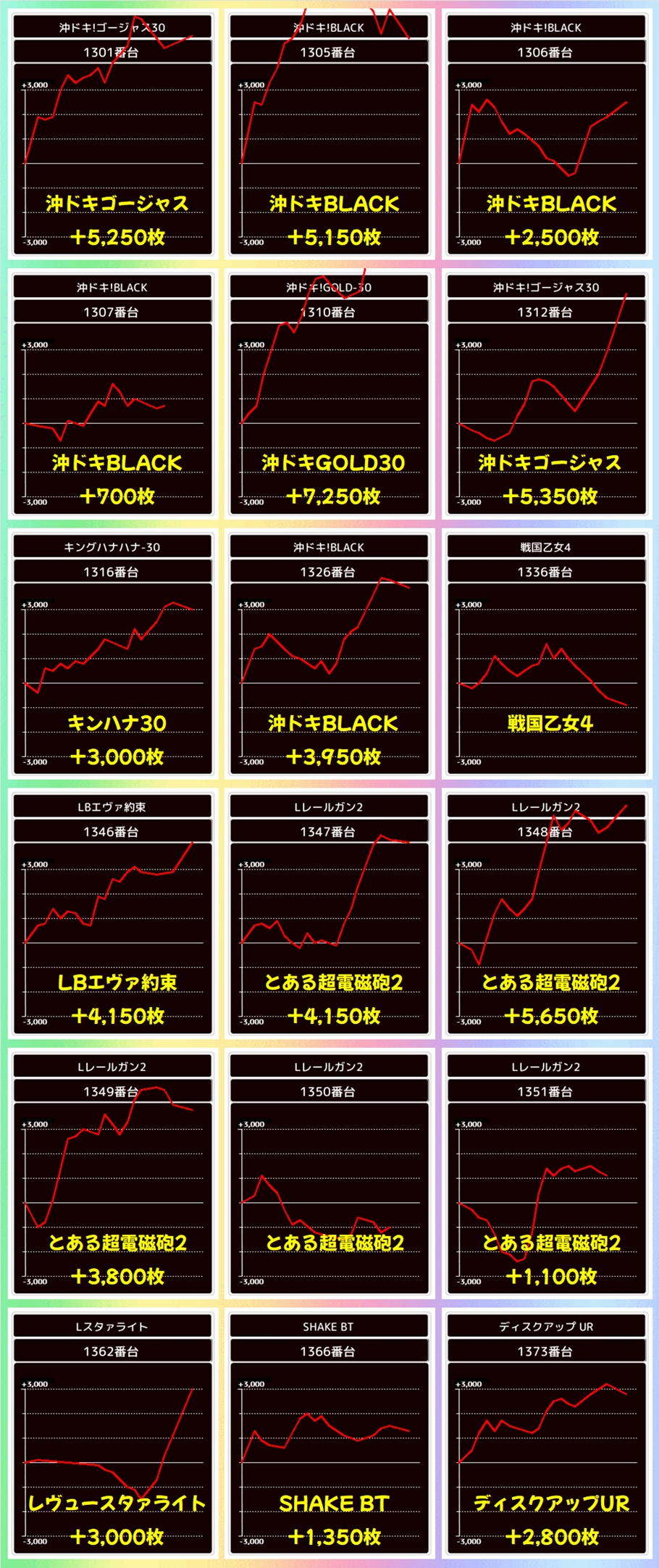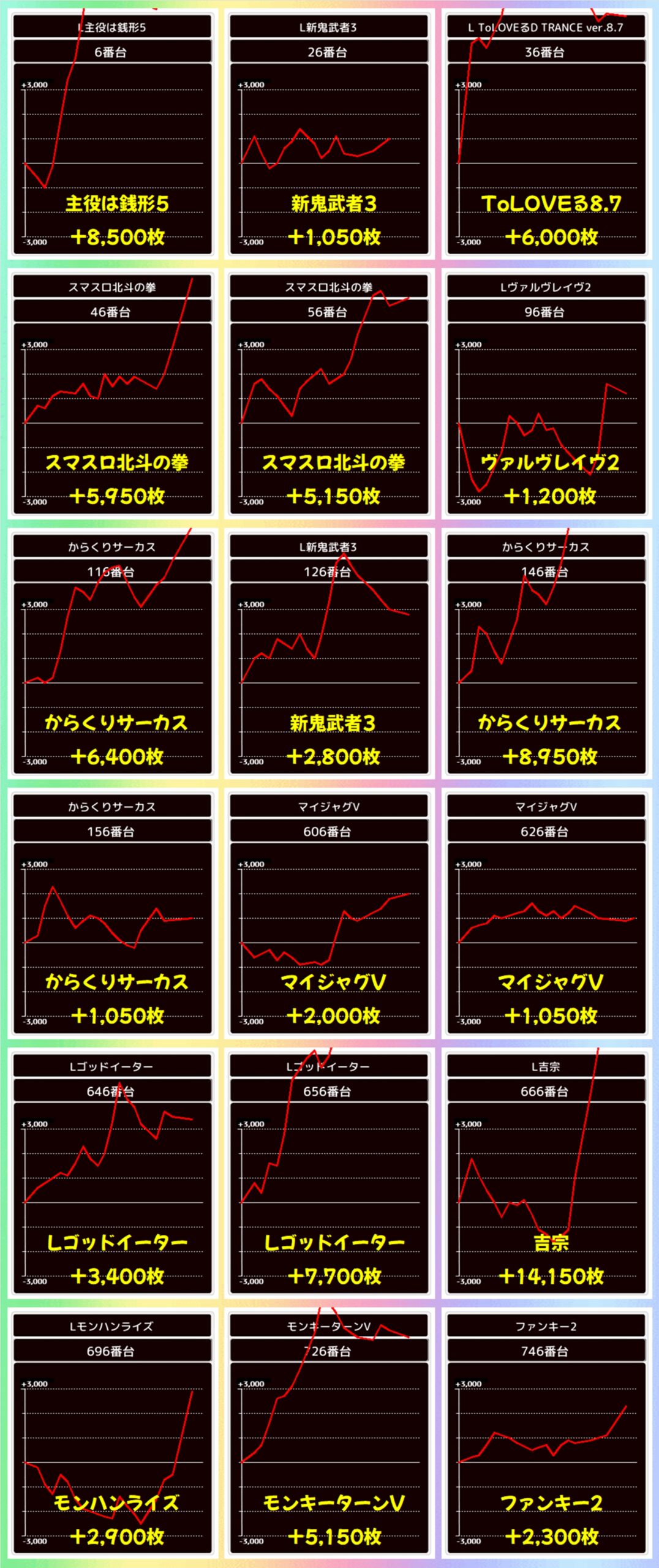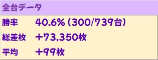 今回の6のつく日は総差枚+73350枚となり、平均+99枚の結果となりました。多数の仕掛けとともにお宝台も続出したため、確認していきましょう。
