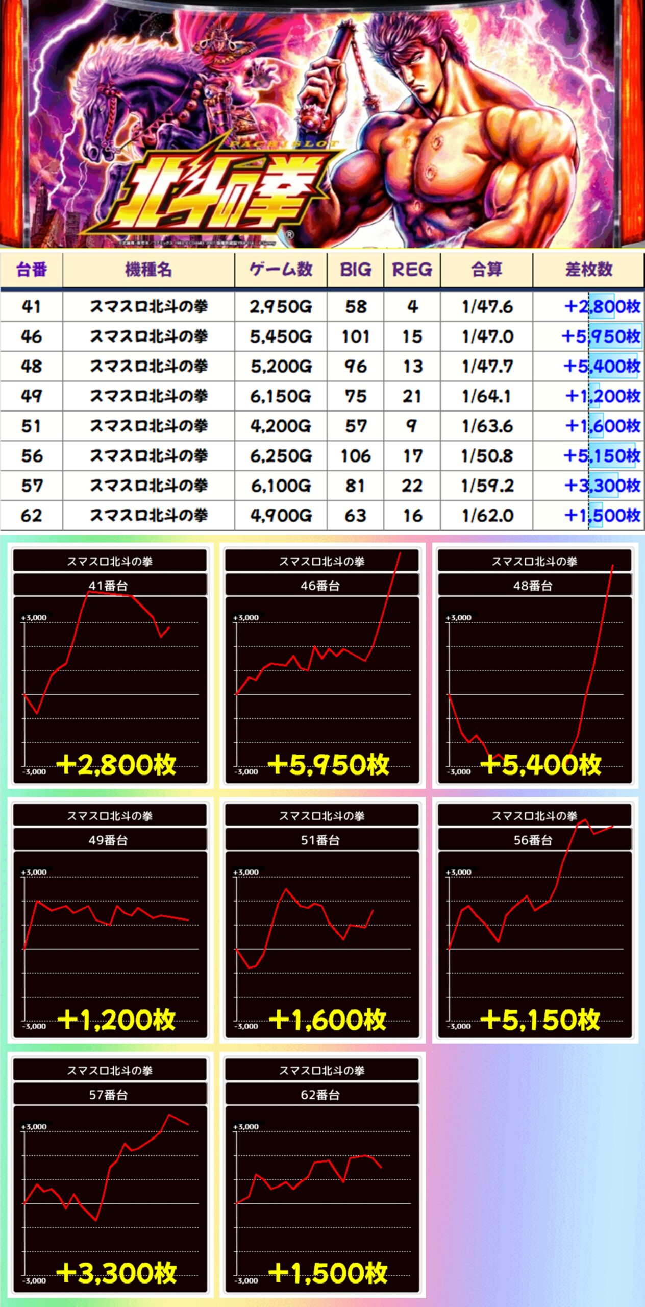新ポスターが登場しているスマスロ北斗の拳からは+5000枚を超える出玉を3台確認。その他にも+3300枚や+2800枚といった出玉も確認することができました。