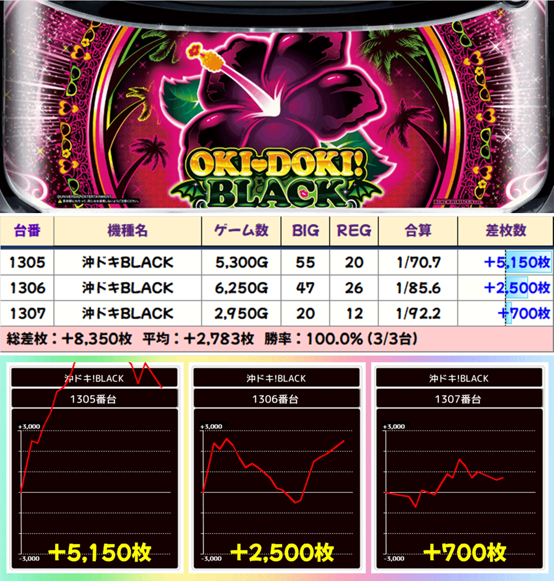 【3台並び】沖ドキBLACK(1305-1307番台)→平均+2,783枚