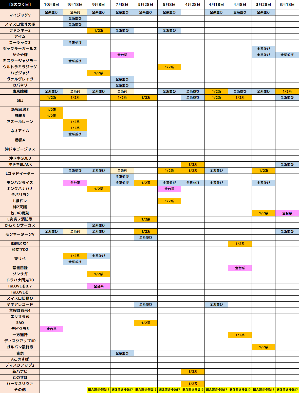 ⑧の日はポスターを見ても分かるように山佐機種を中心とした仕掛けに期待でき、過去の傾向を見ても山佐機種が強めとなっております。もちろん、山佐機種以外にもチャンスはあり、様々な機種の仕掛けに期待できる一日となります。