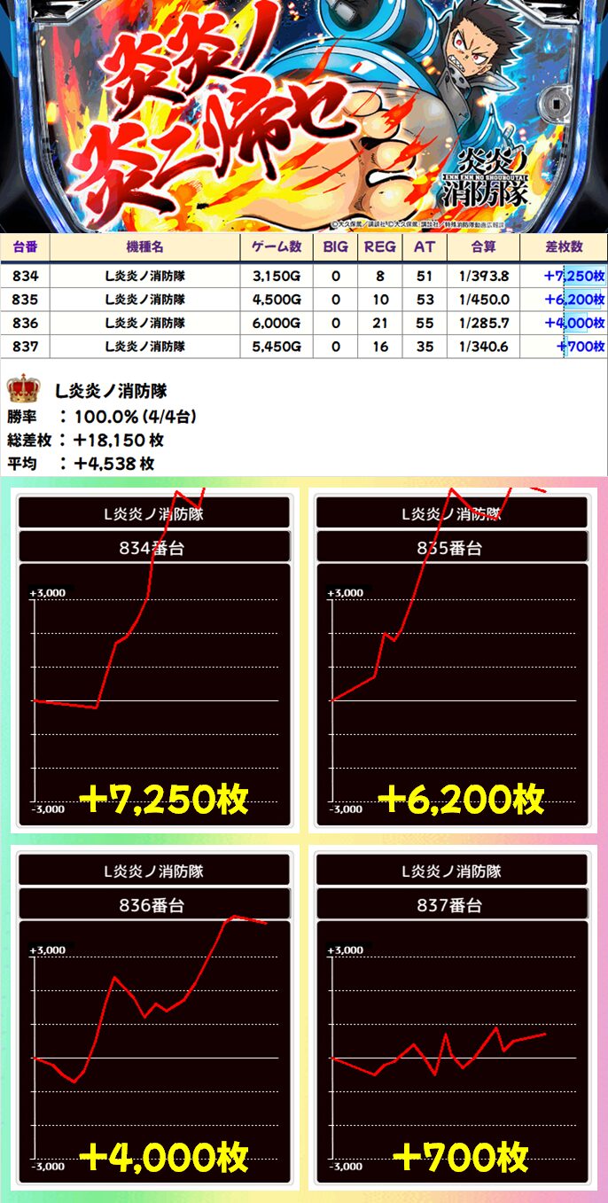 4台設置の炎炎は全台プラスという好成績!平均差枚も4000枚超と素晴らしい結果を残しました!