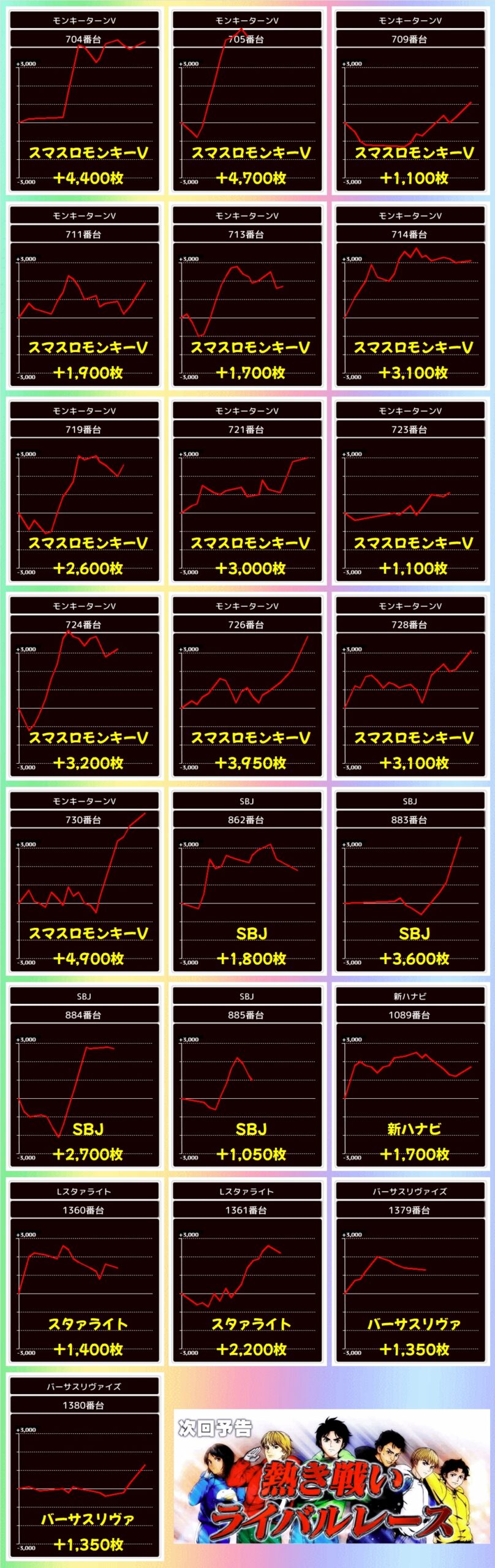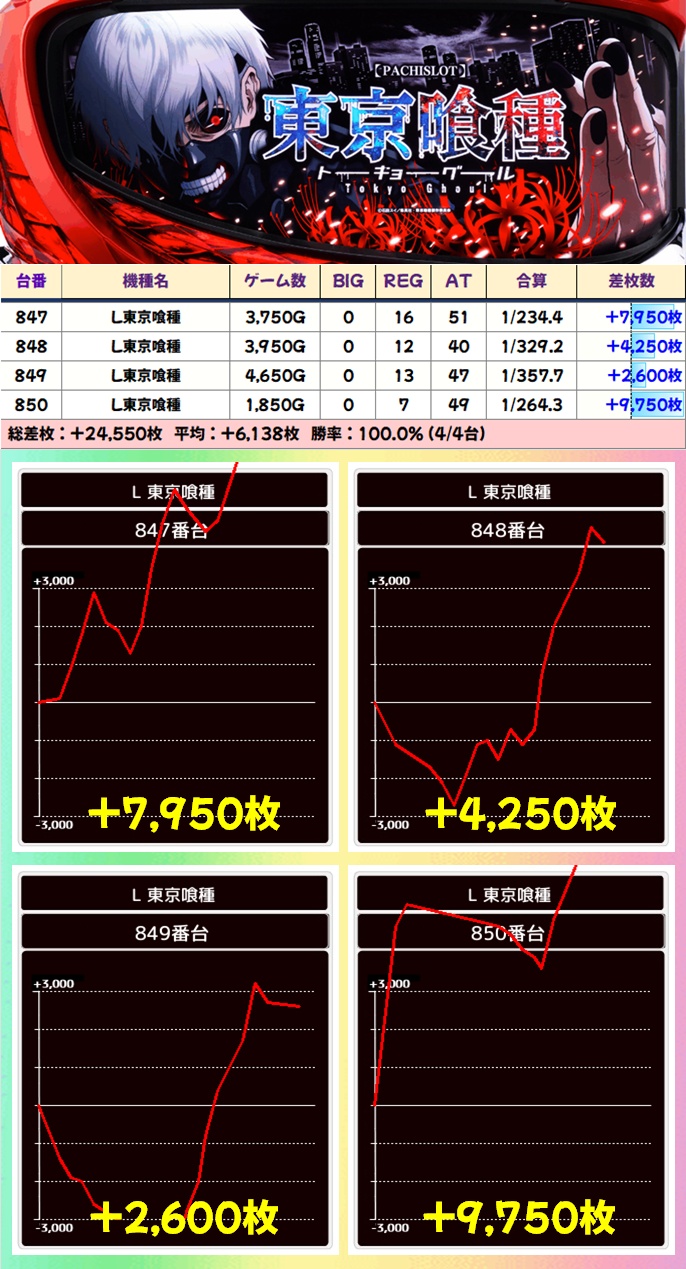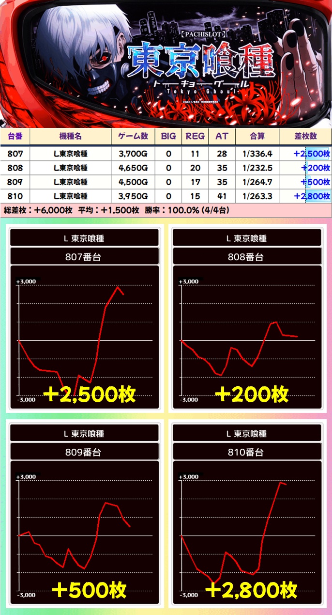 歌舞伎おなじみの並び仕掛けは本日も大量!人気スマスロの喰種やマギレコの並びは平均2000枚超と大量獲得の並び複数!ジャグも複数並びがあり、いずれも勝率100%と優秀でした!