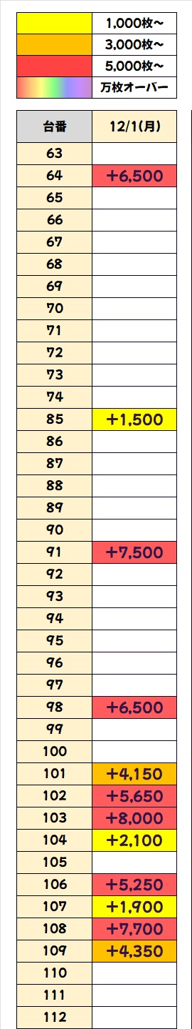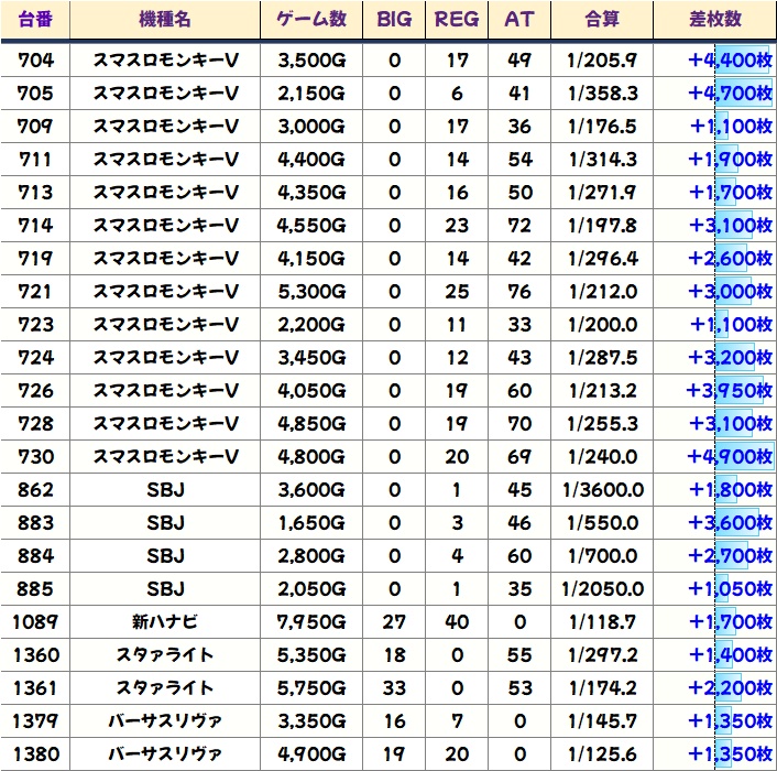 この日はヴヴヴ2に、列全や並び仕掛けがありましたが、単品優秀台も確認!合計で5000枚超が7台と大量獲得台も数多くあり!