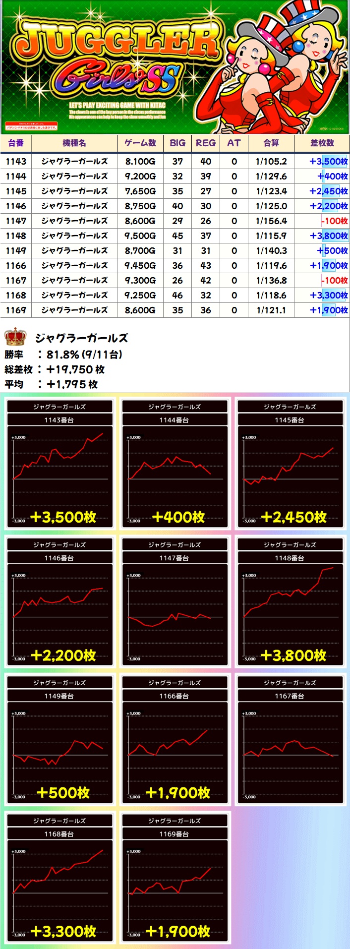 ジャグラーガールズ (9/11台+) ➡平均 +1,795枚