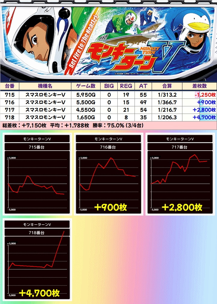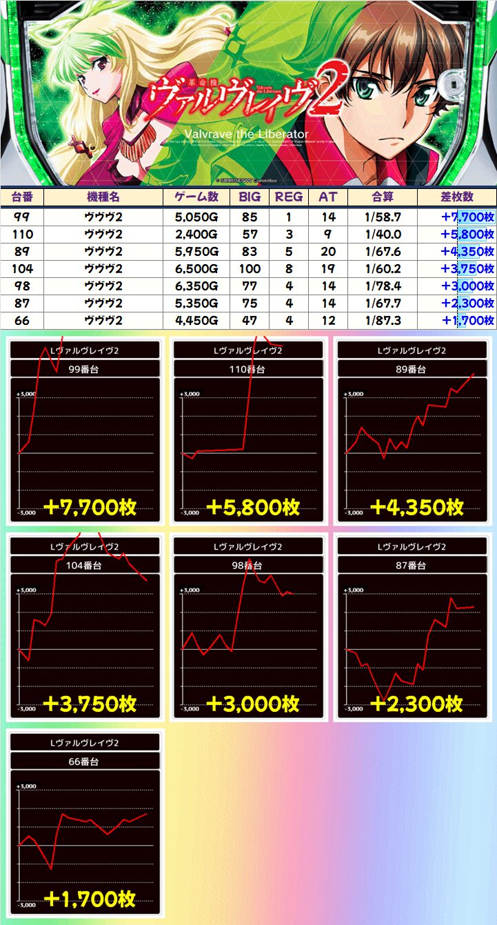 並び仕掛けもあった「ヴァルヴレイヴ2」は+7700枚を筆頭に計6台が+2000枚以上と出玉充実!