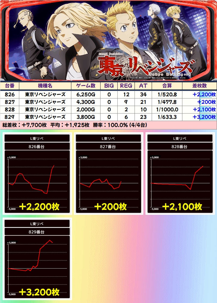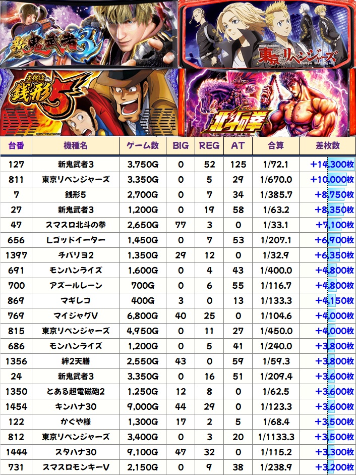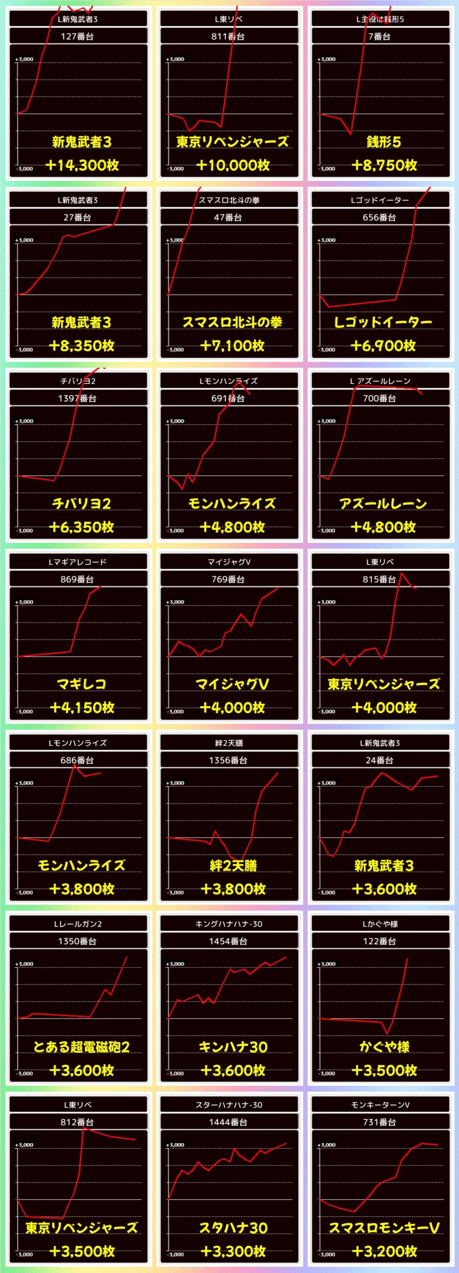 この日は仕掛け以外にも単品での投入も多数あったようで、「新鬼武者3」&「東リベ」の万枚オーバーなど、素晴らしい台を多数確認!