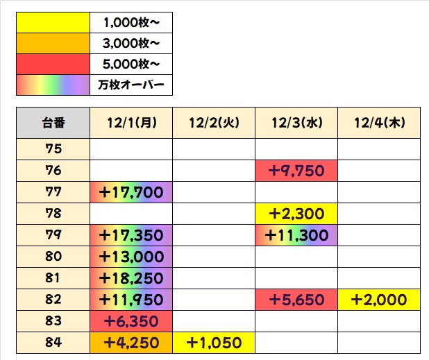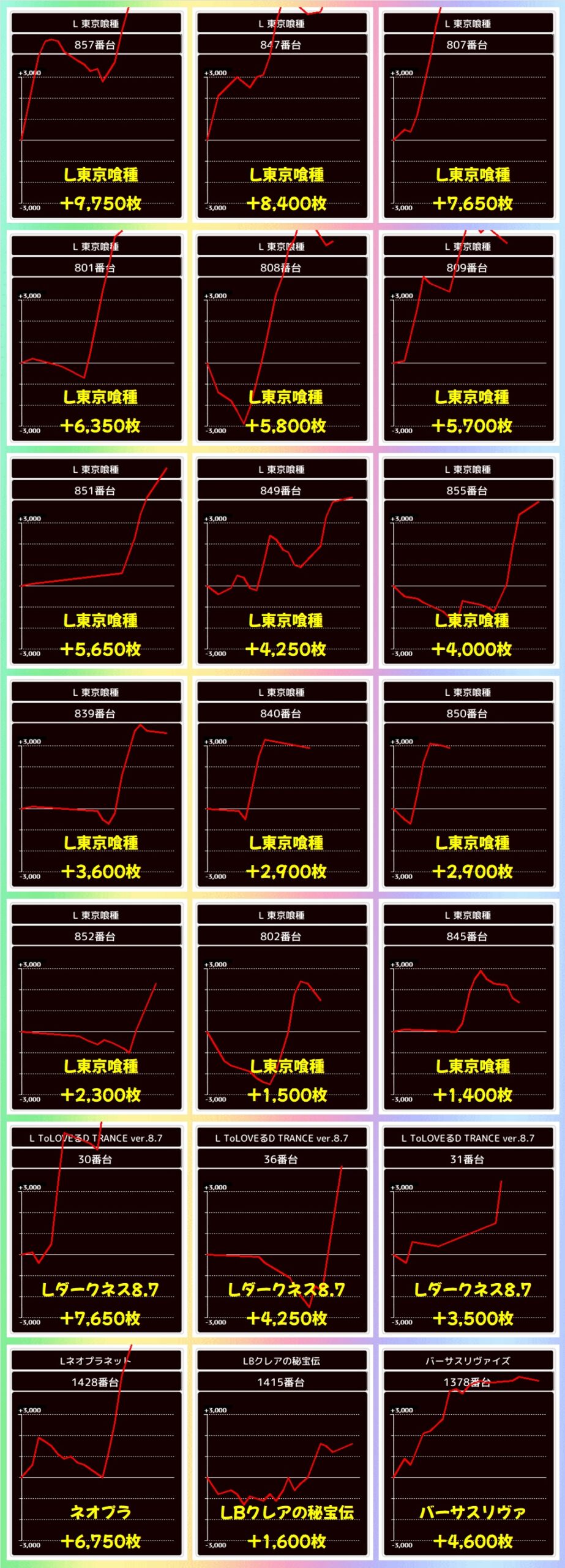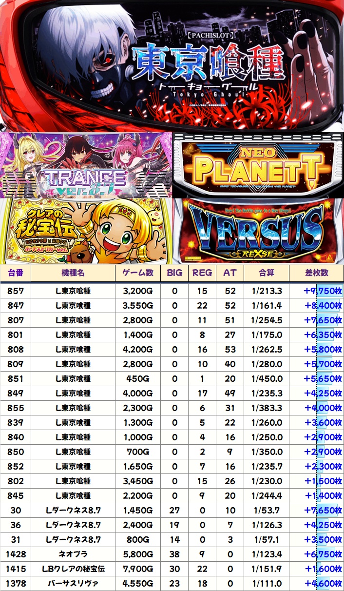 大量31台の設置を誇る主役機種である「L東京喰種」が1/2系濃厚で+9750枚を筆頭に計13台が+2000枚を突破! この機種だけで総差枚+4.3万枚は見事でしたね!