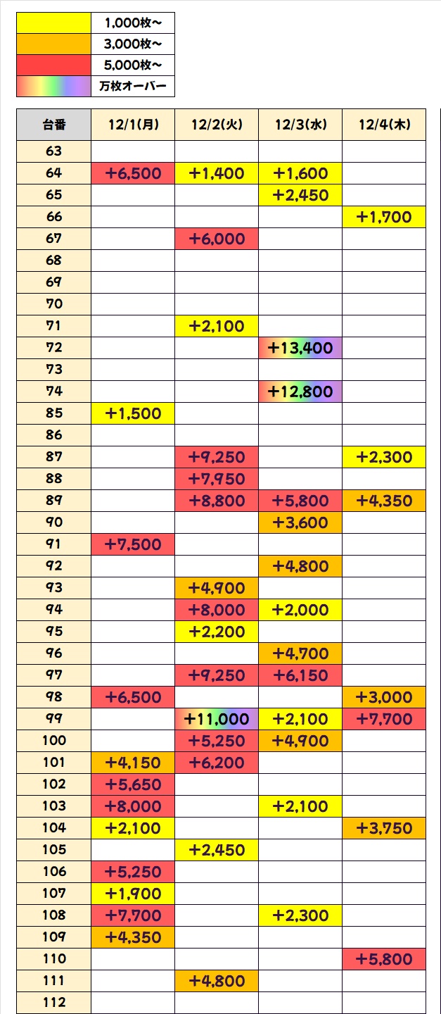 前回(11/14)は4台設置の「L炎炎」が全台系濃厚、「絶対衝激IV」が1/2系濃厚、4台並びが10箇所と傾向通りでした!