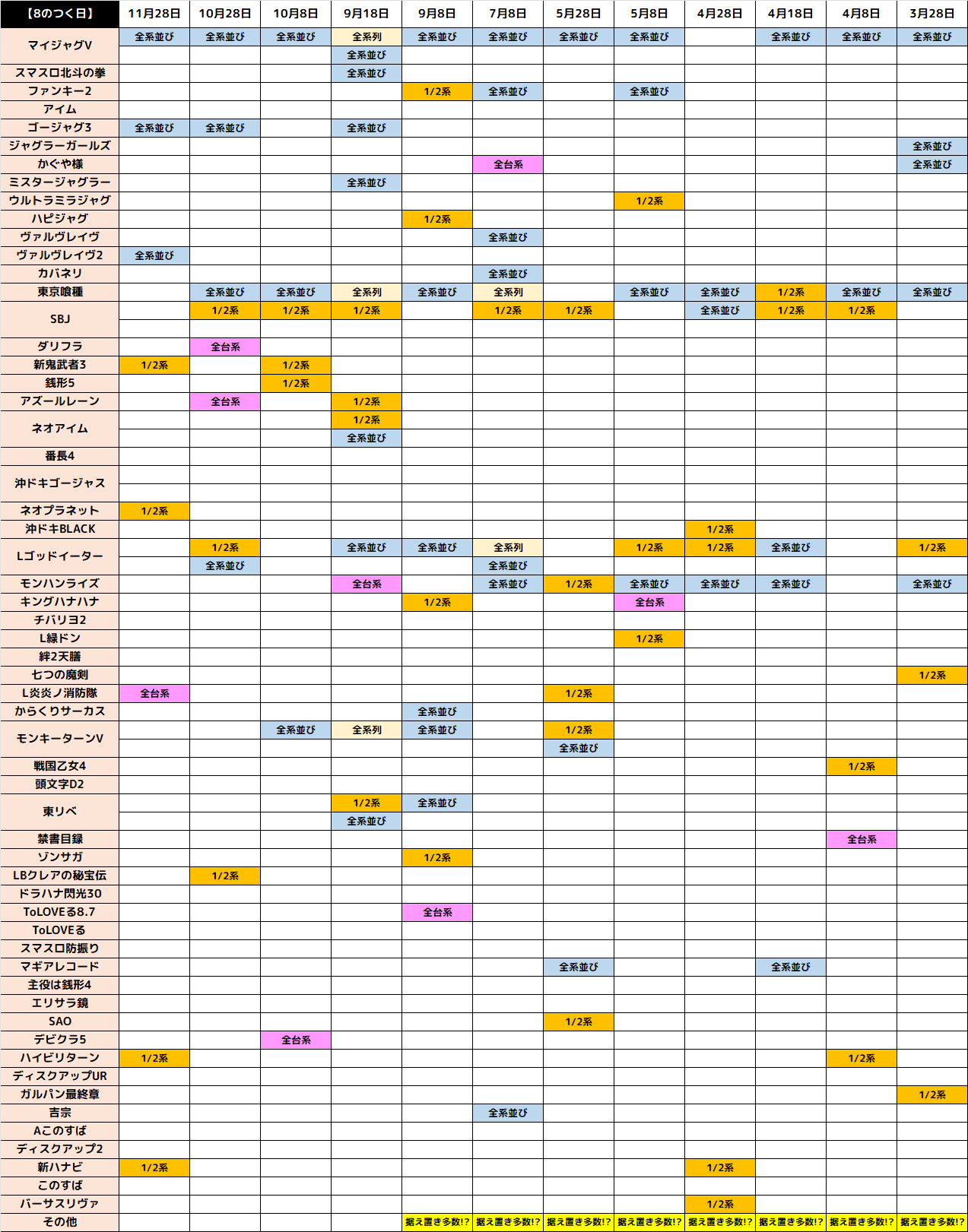 ⑧の日はポスターからも推測できるように山佐機種を中心とした仕掛けに期待でき、過去の傾向を見ても山佐機種が強めになっています。