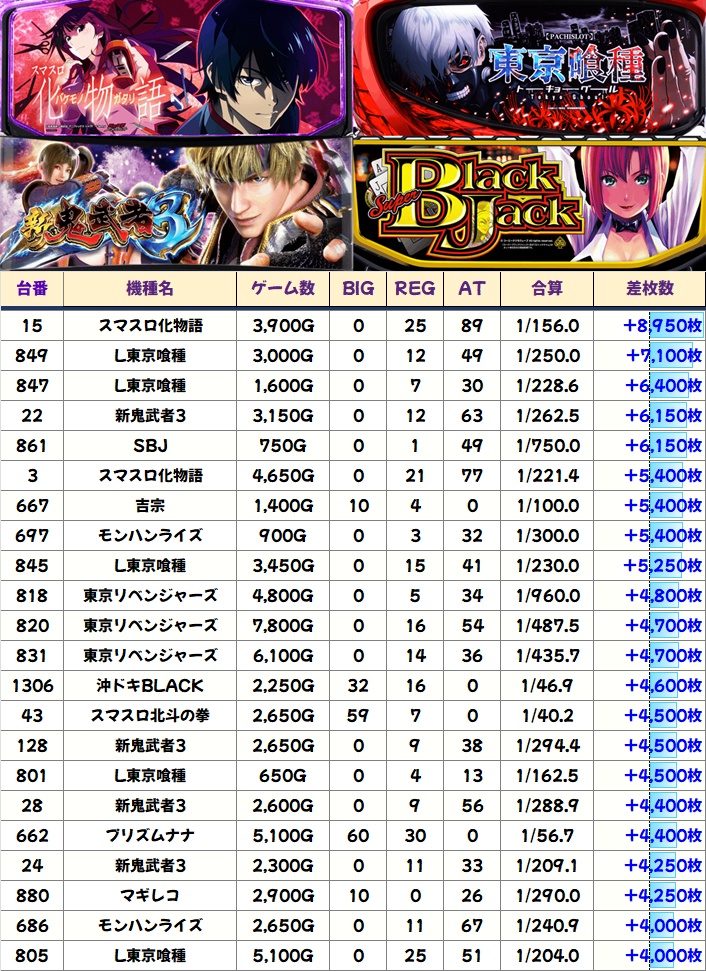 前述した仕掛け以外にも「化物語」の+8950枚&+5400枚、「プリズムナナ」の+4400枚など本日導入の最新機種からも優秀台を確認!明日以降も楽しみですね!