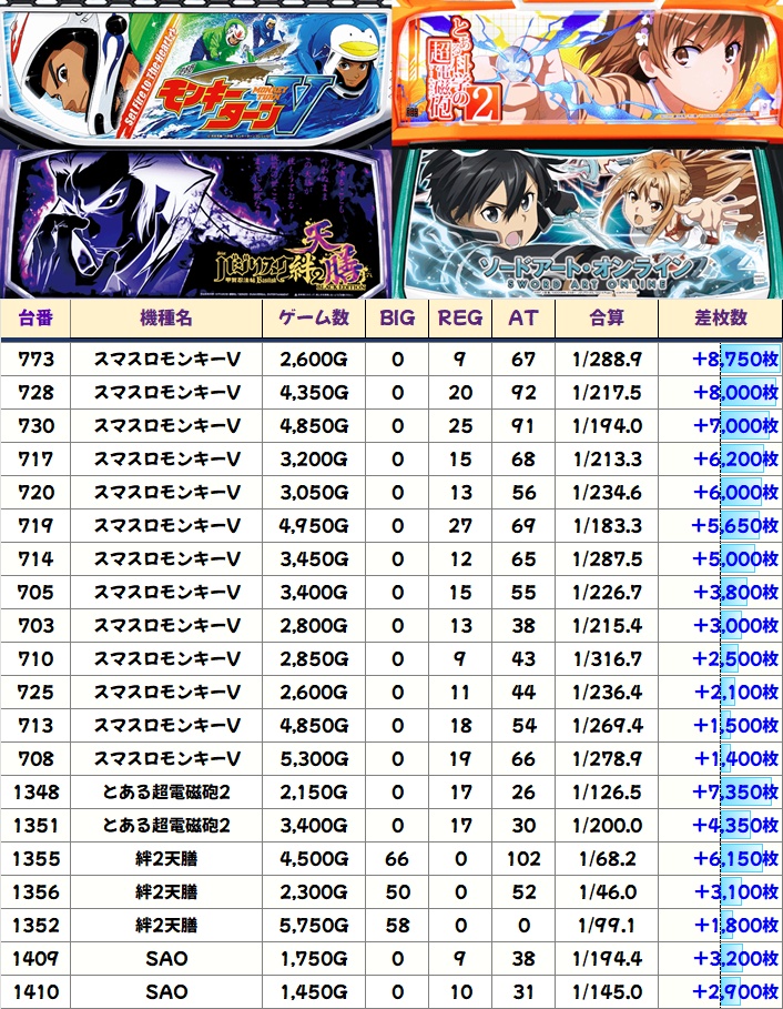 他にも4台以上設置の人気スマスロが3機種対象になりましたが、「とある超電磁砲2」の+7000枚以上、「絆2天膳」の+6000枚以上などが特に目立っていました!