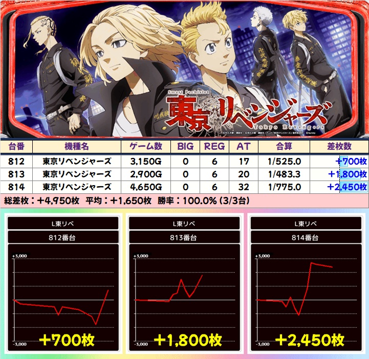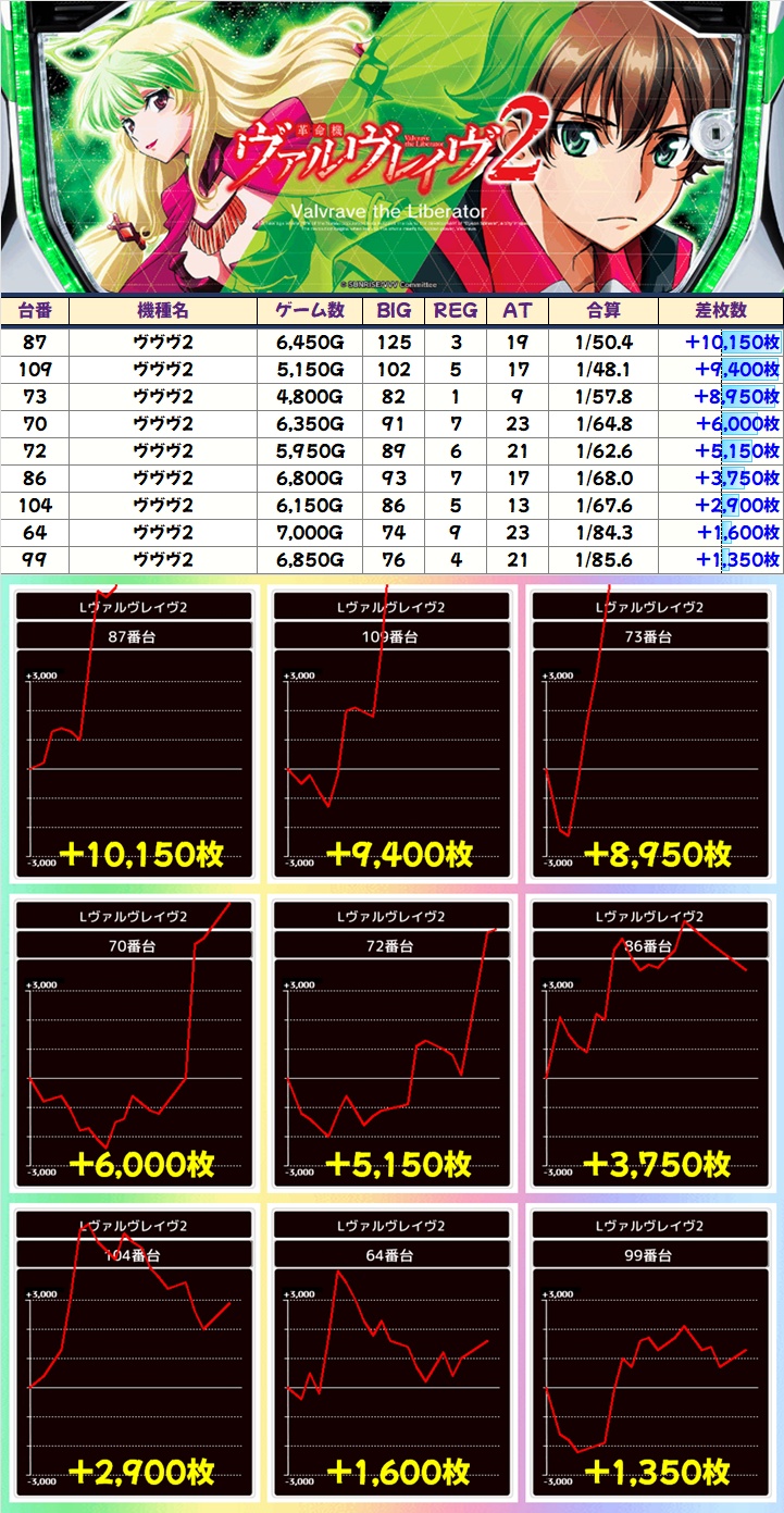 連日好調の「ヴヴヴ2」は、この日も平均+4500枚以上の並びが複数など抜群で万枚を筆頭に計6台が+3000枚を突破!明日以降も大注目です!