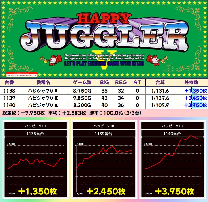 ■ハピジャグV Ⅲ(5/7台+)➡平均+1,207枚