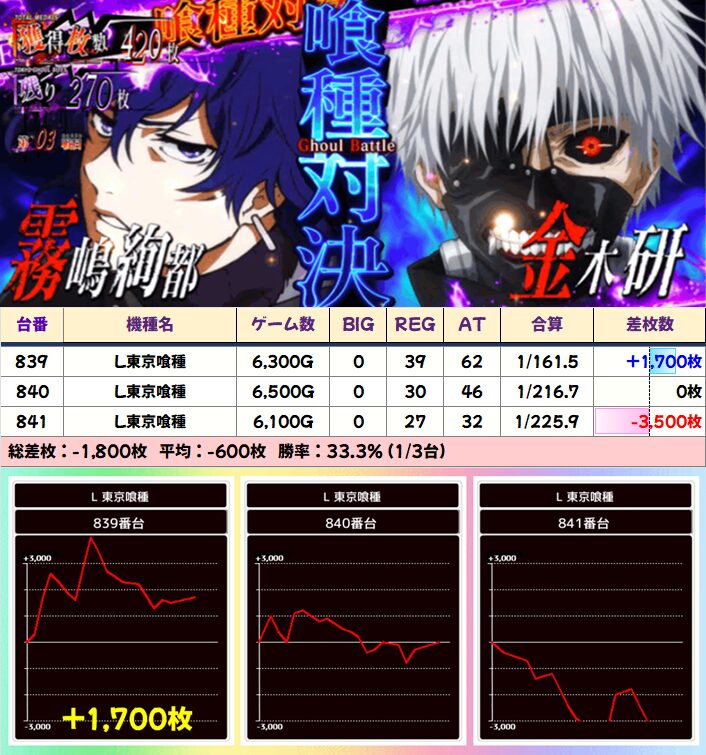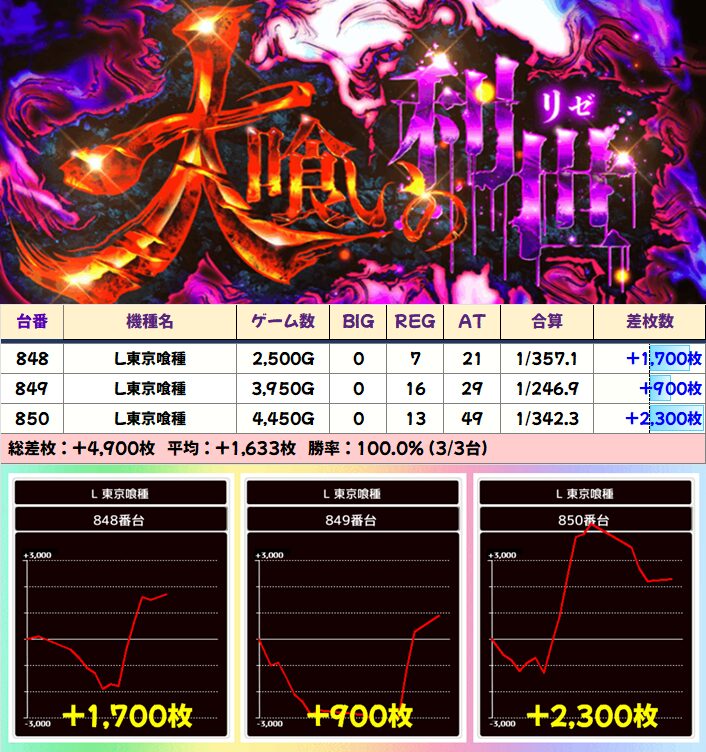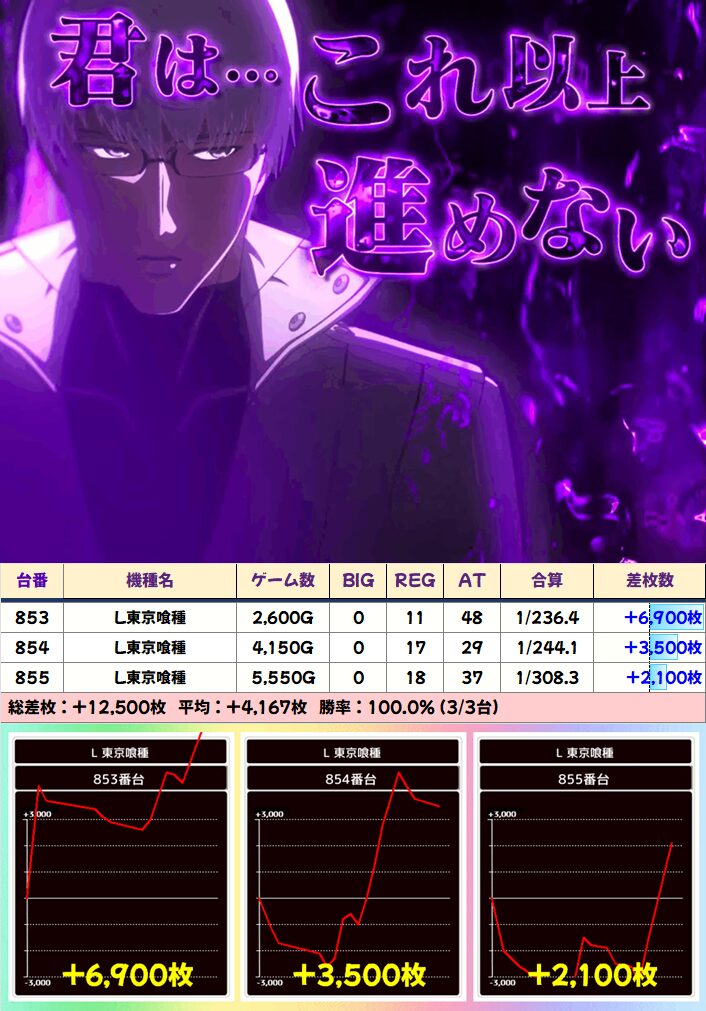 中でも4か所も並びがあった「東京喰種」は平均+4000枚以上、平均+3000枚以上など中身も充実!
