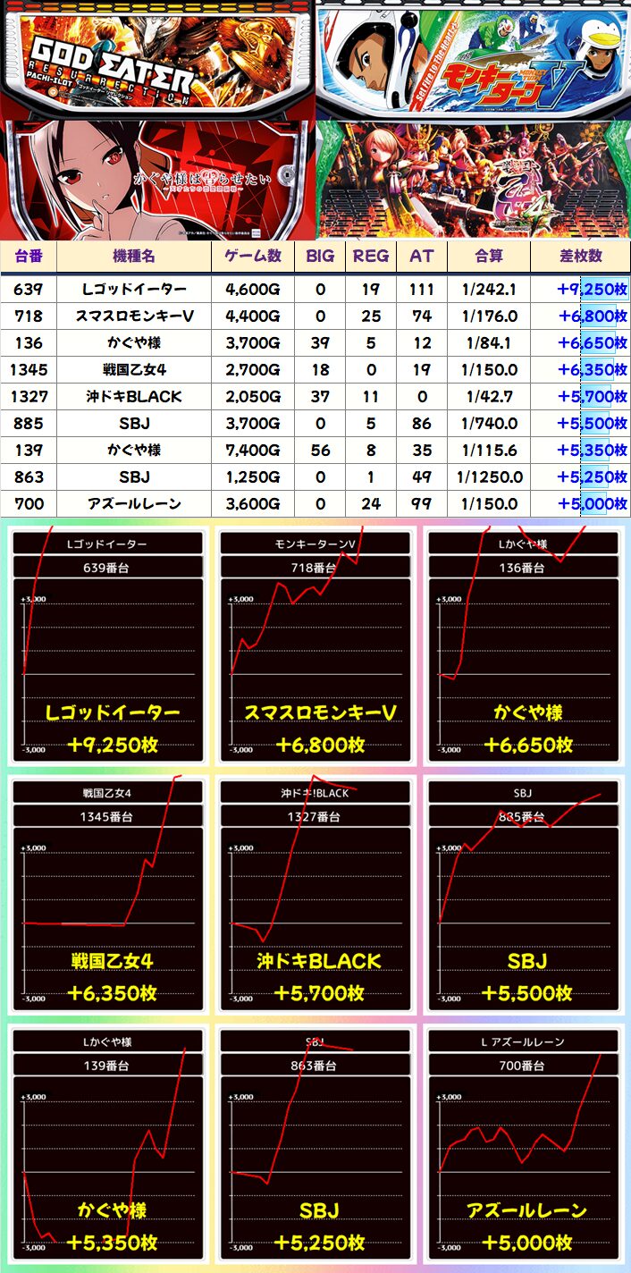 前述した大量すぎる仕掛け以外にも「ゴッドイーター」の+9000枚以上など、まだまだ優秀台がたっぷり!