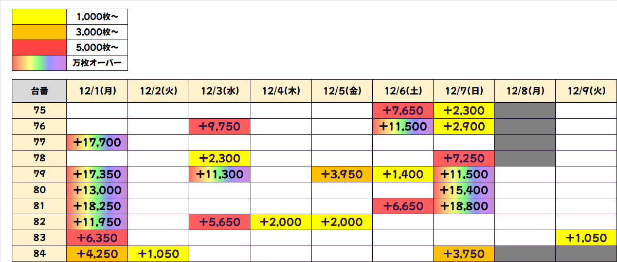 対象の全機種は半数以上がプラスと安定していましたが、特に「プリズムナナ」は3台中2台が+3000枚クラスと目立っていました!