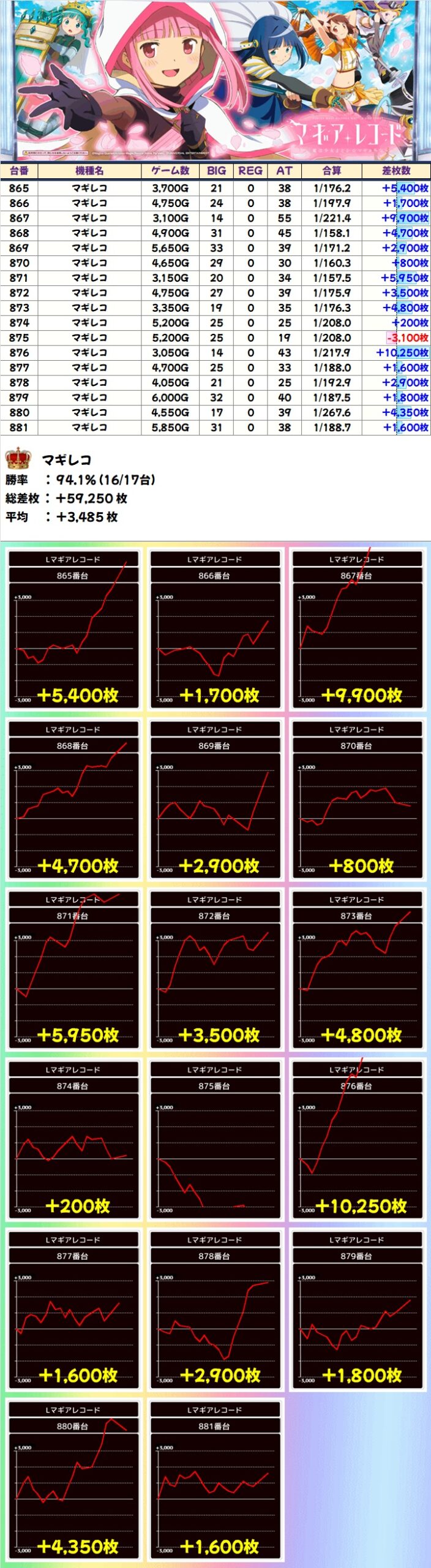 万枚オーバーを筆頭に17台中16台がプラスと超絶安定の好結果で平均+3485枚!「マギレコ」だけで約6万枚は圧巻!