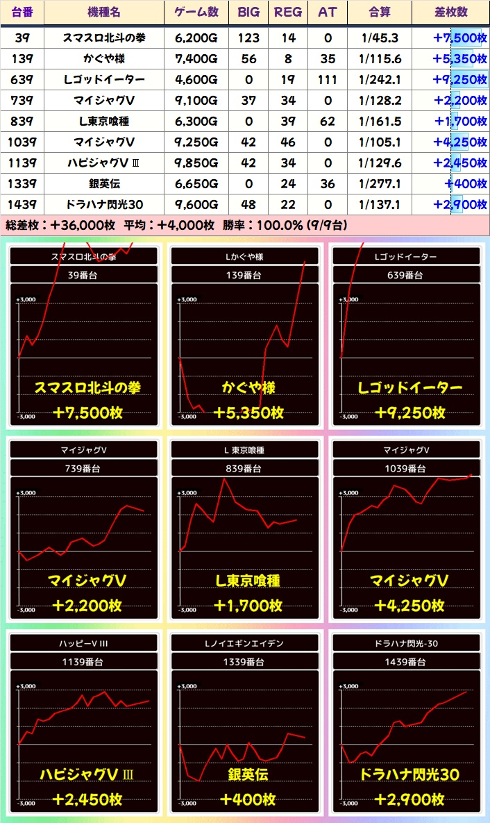 この日も9台中9台と全勝かつ平均+4000枚と異次元の好結果! 次回開催時も良番なら末尾㊴は狙う価値絶大!
