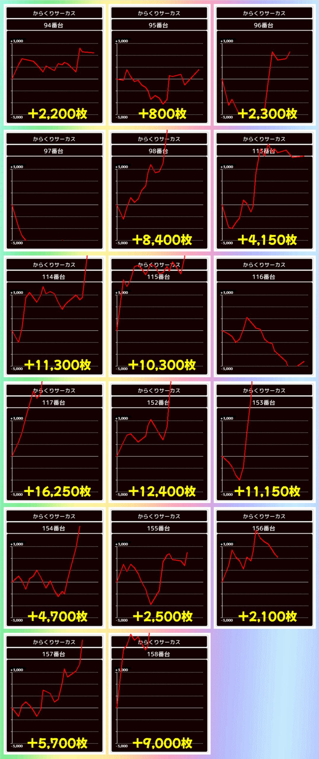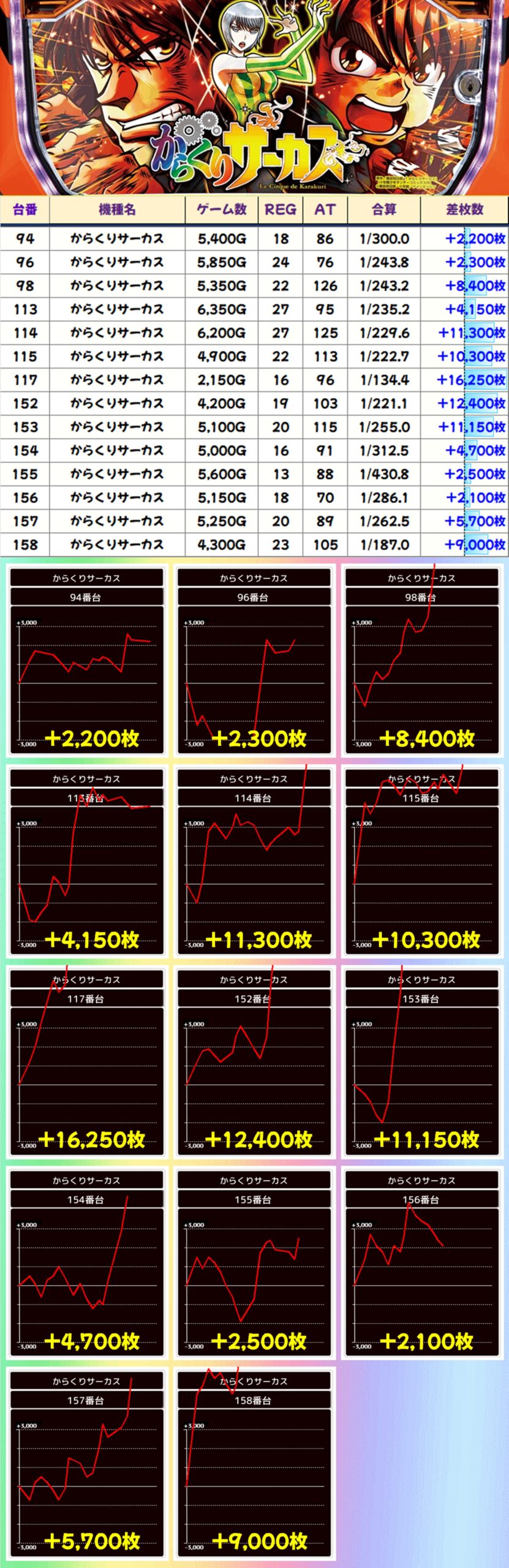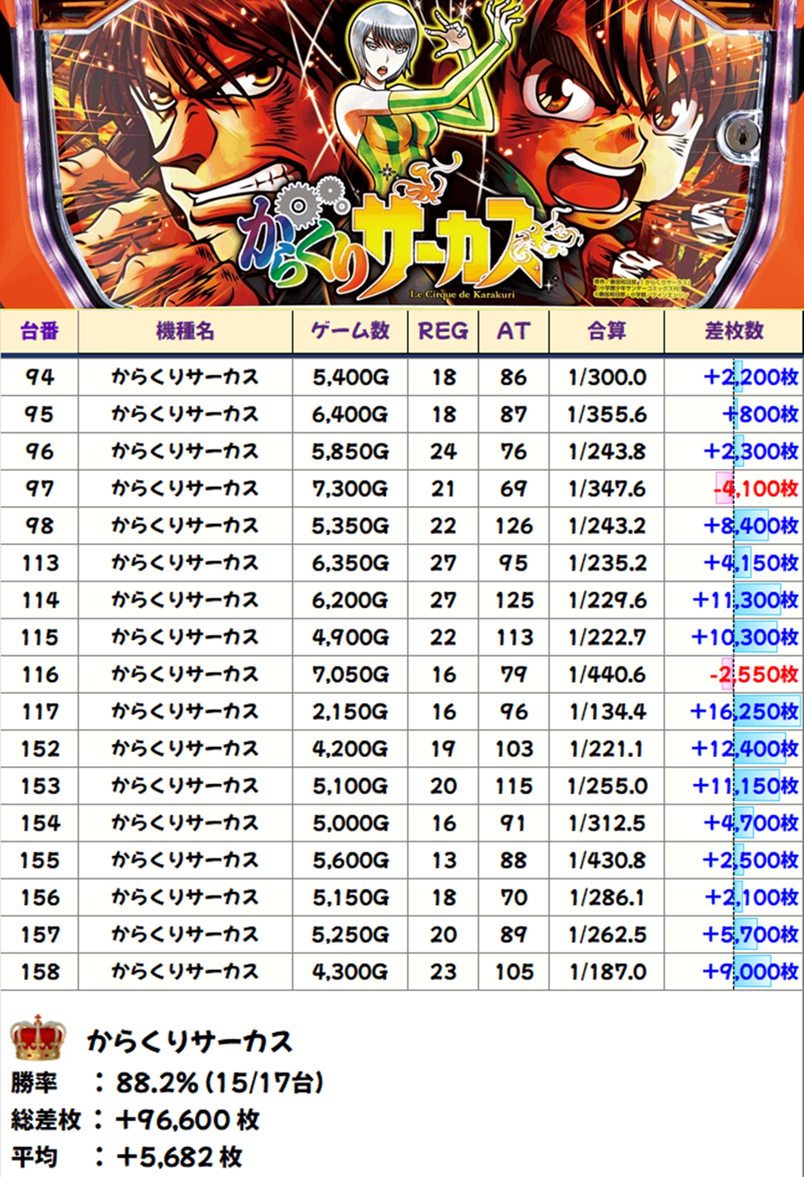 全台系濃厚の仕掛けで紹介した通り、からくりサーカスには大量出玉が続出!万枚オーバー5台は圧巻ですね!