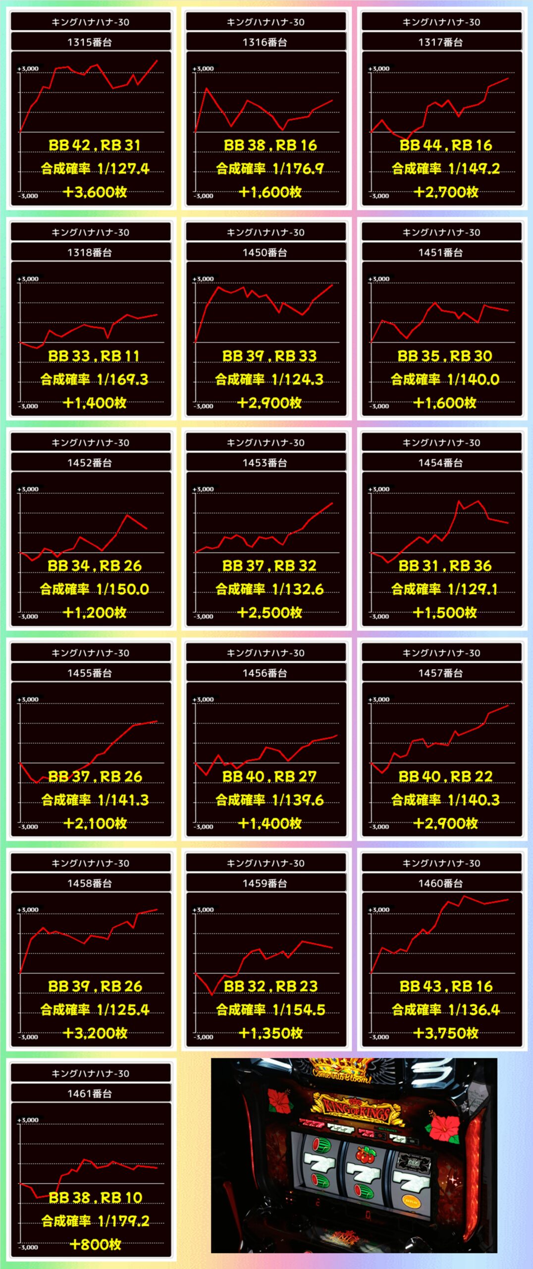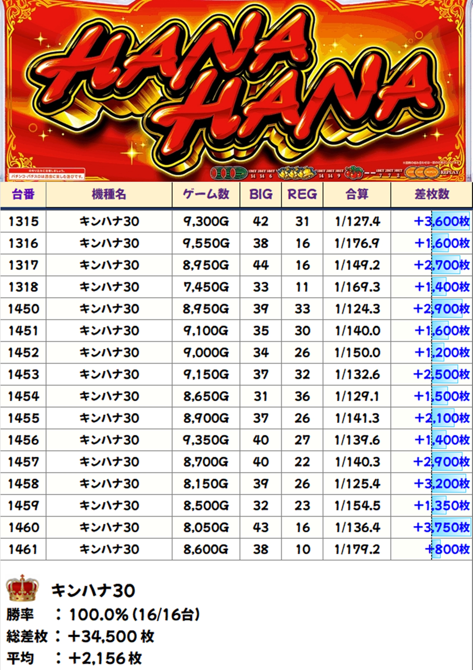 16台のキンハナ30が全台系濃厚となり、こちらは全台がプラス差枚かつ大量出玉も多数出現!