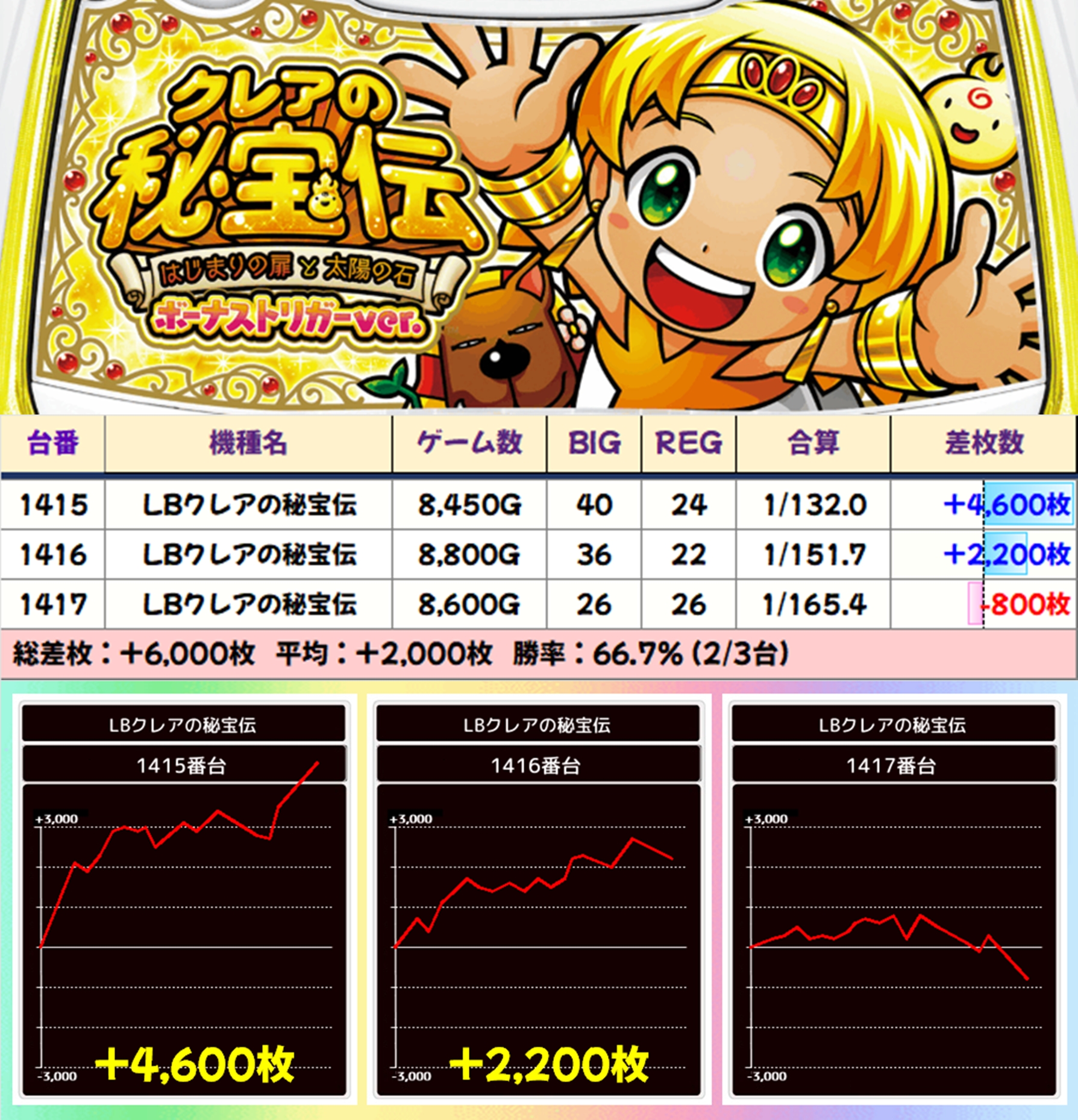 【3台並び】LBクレアの秘宝伝(1415-1417番台)→平均+2,000枚