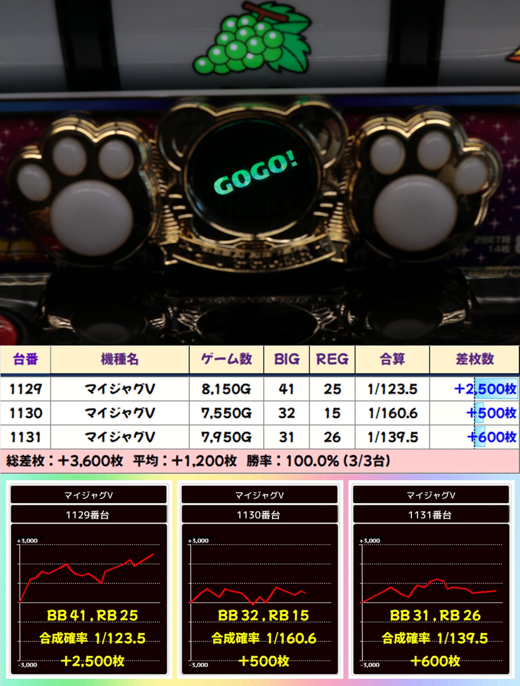 【3台並び】マイジャグV(1129-1131番台)→平均+1,200枚
