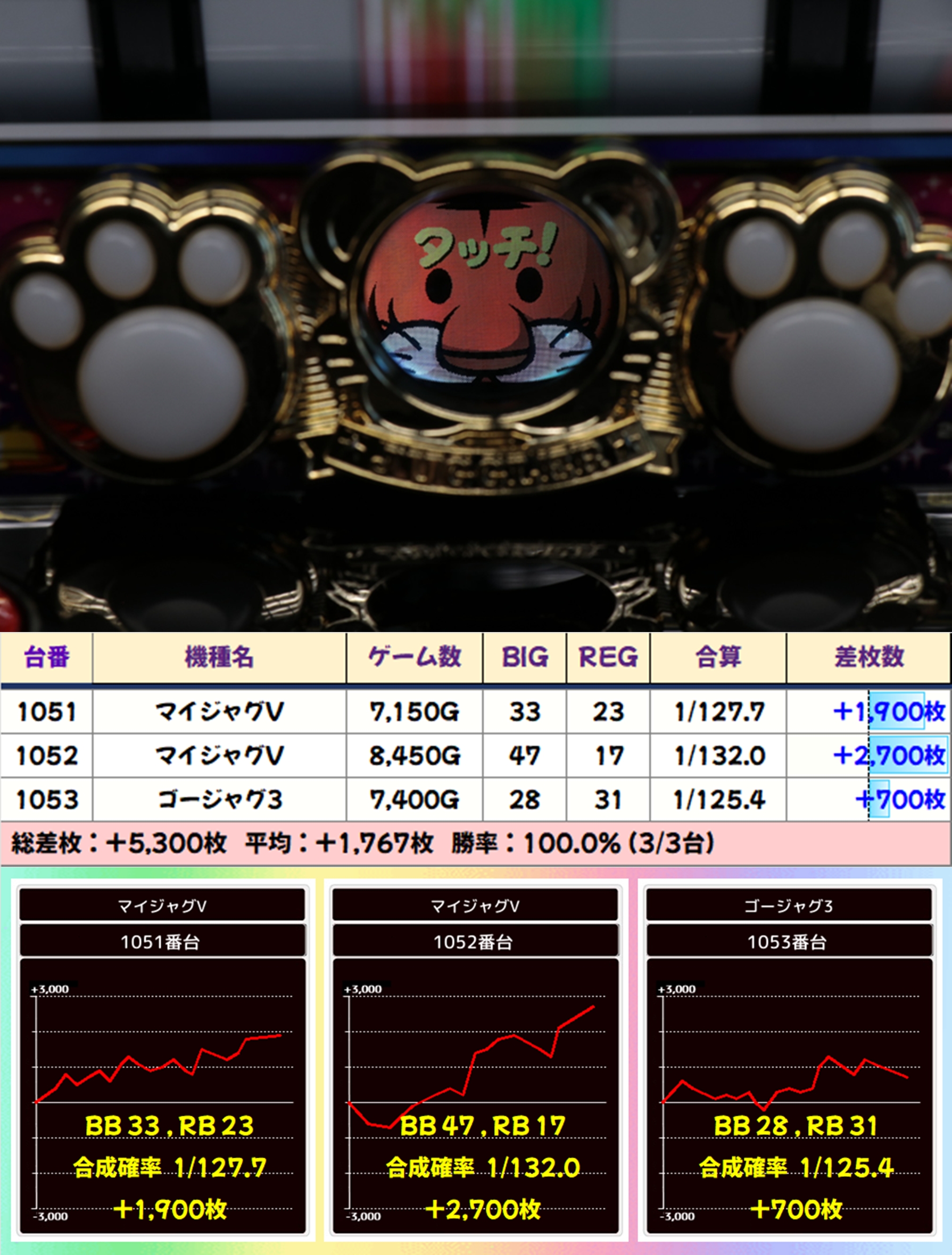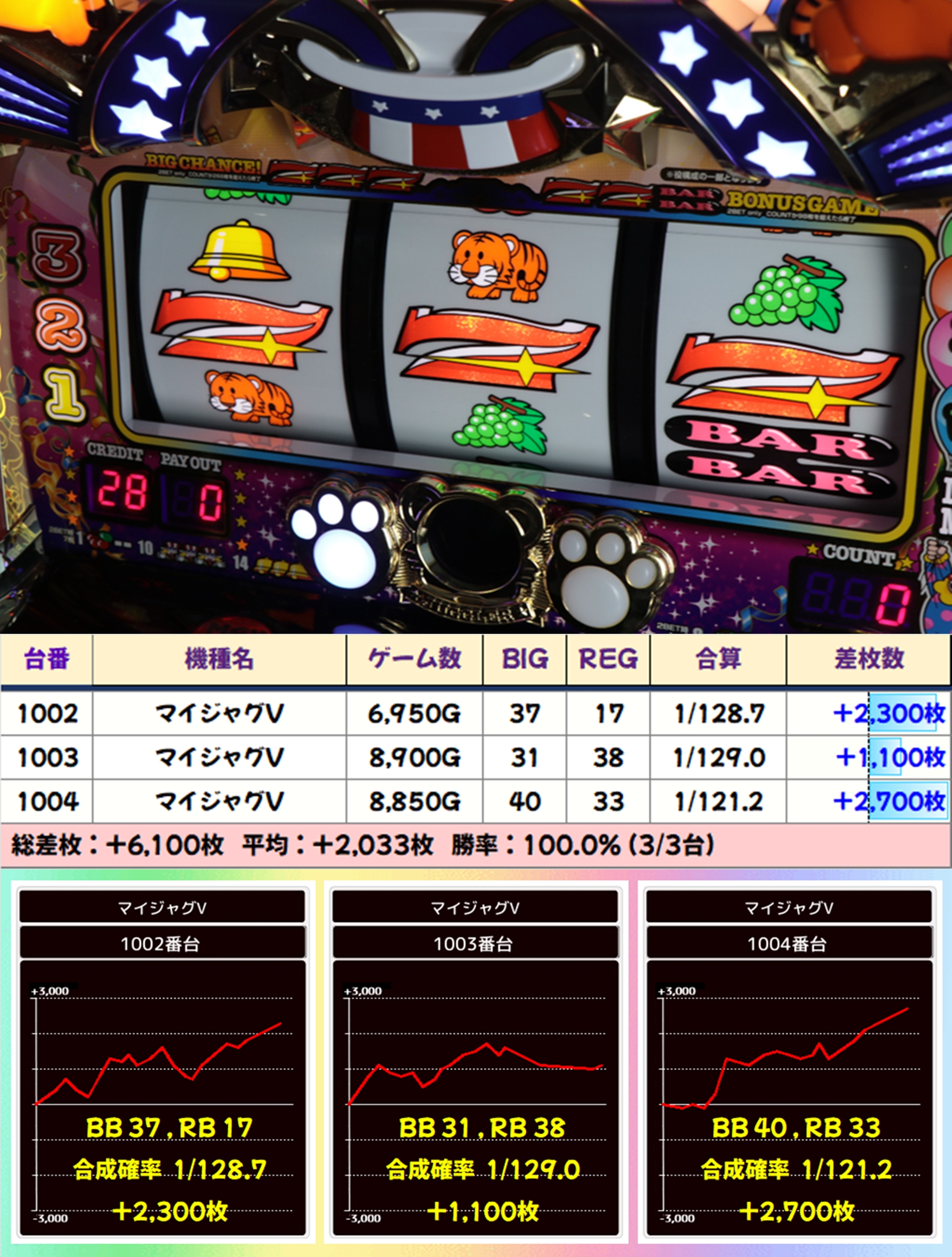 マイジャグVには6か所、合計15台の並びの仕掛けが登場。全台がプラス差枚の好結果を残しました。マイジャグVも③⑨の日に並びの仕掛けが高確率で出現しているため、次回も複数の並びの仕掛けが出現する可能性が高いと思われます!