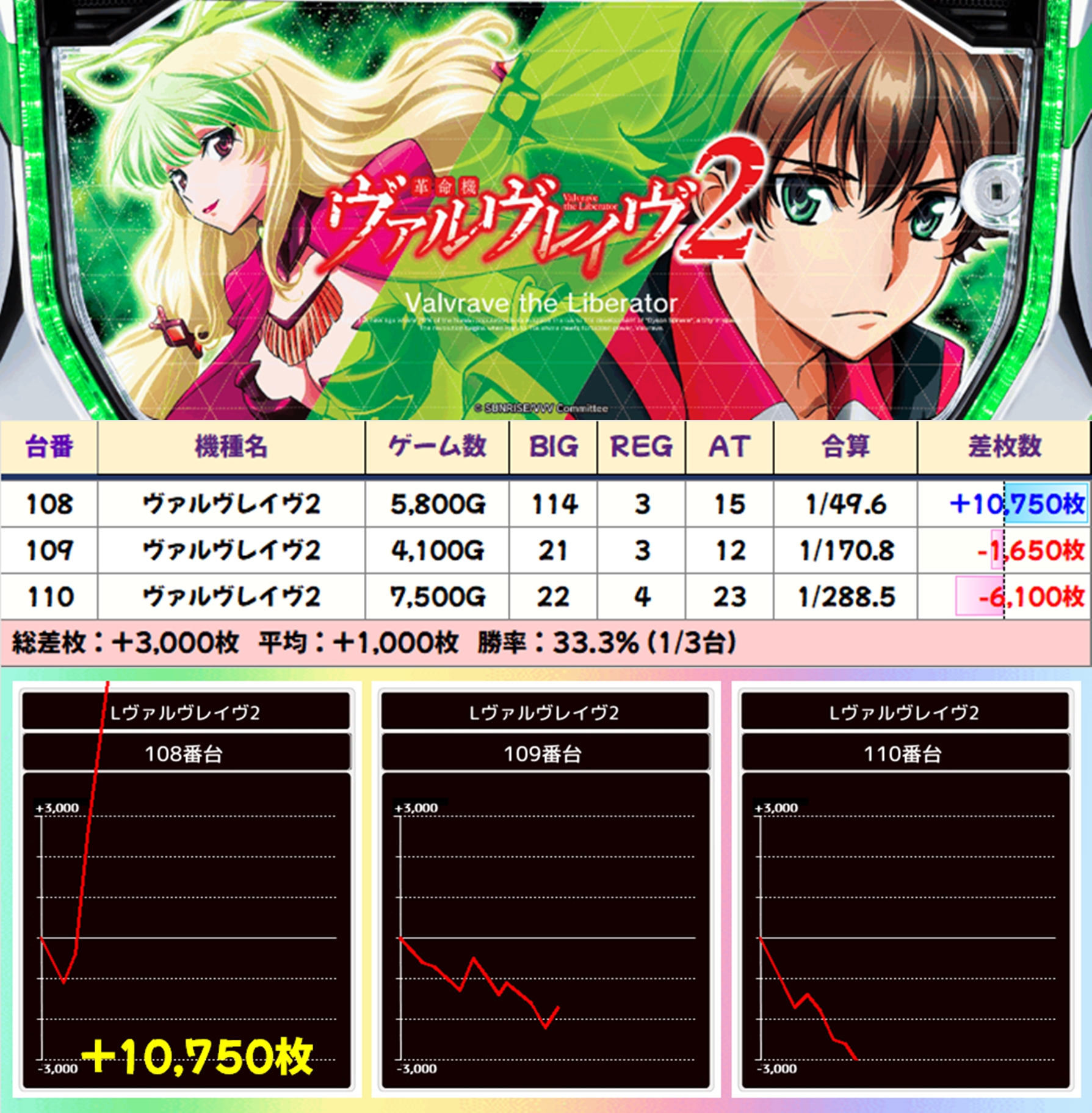 【3台並び】ヴァルヴレイヴ2(108-110番台)→平均+1,000枚