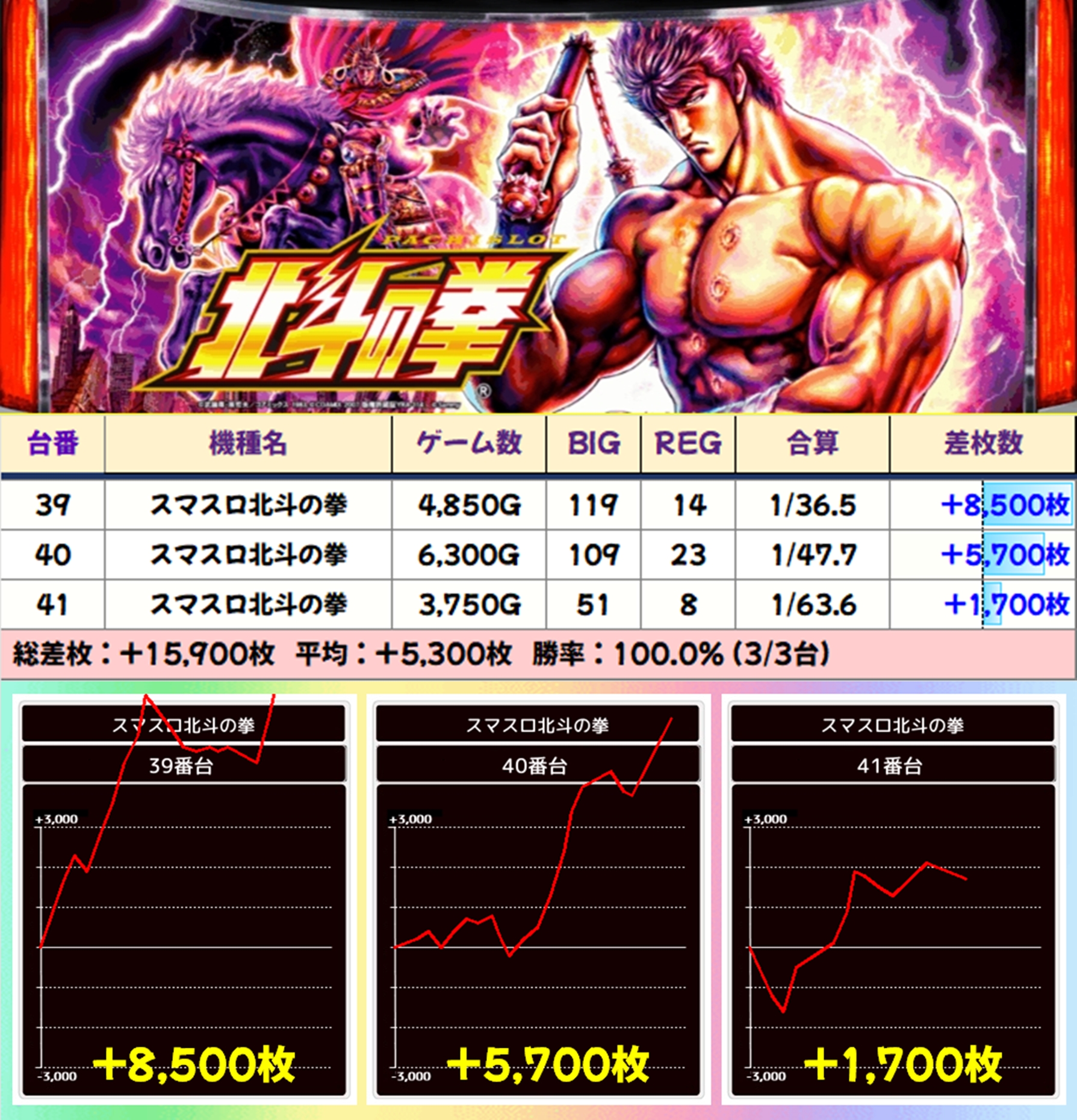 【3台並び】スマスロ北斗の拳(39-41番台)→平均+5,300枚