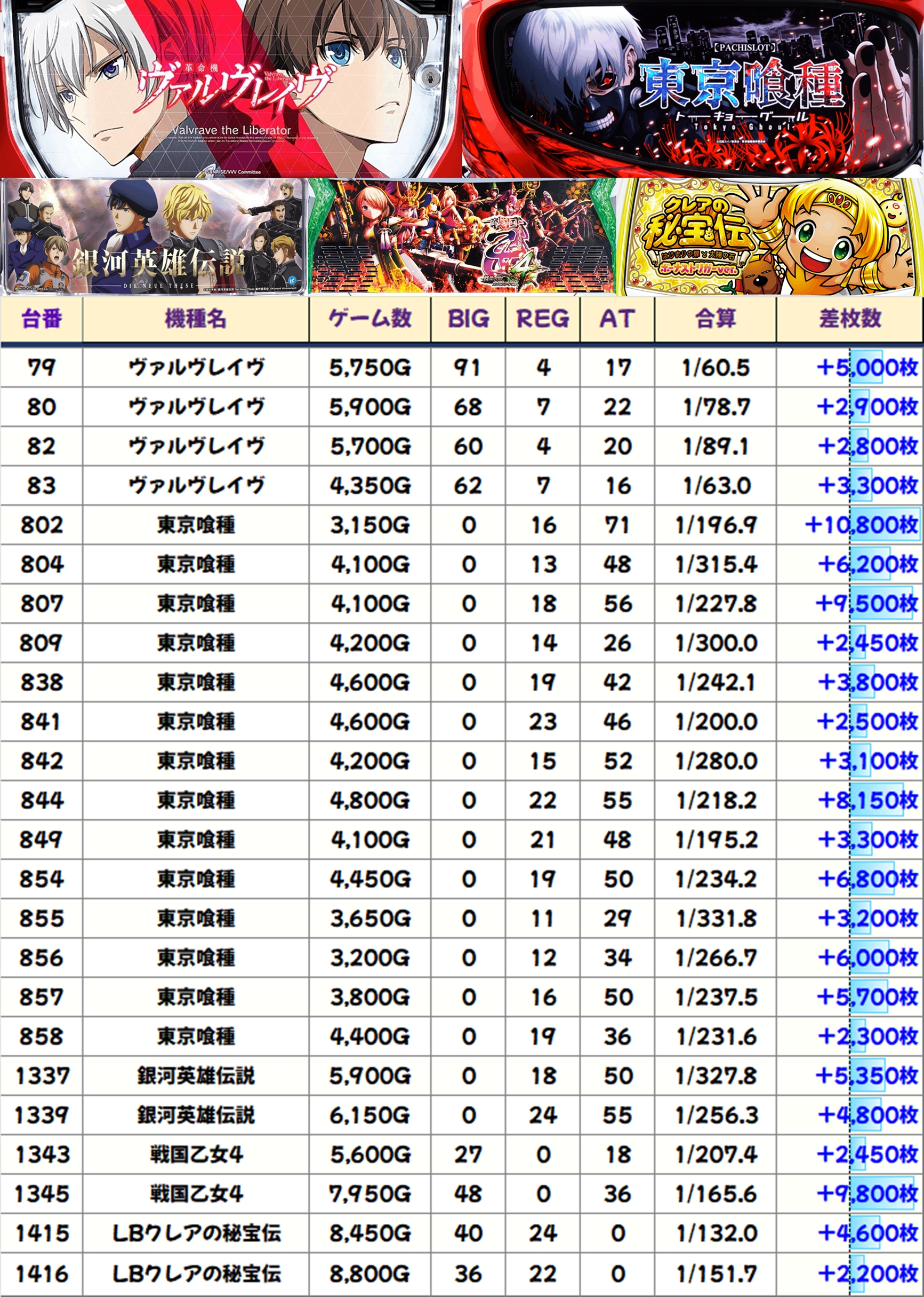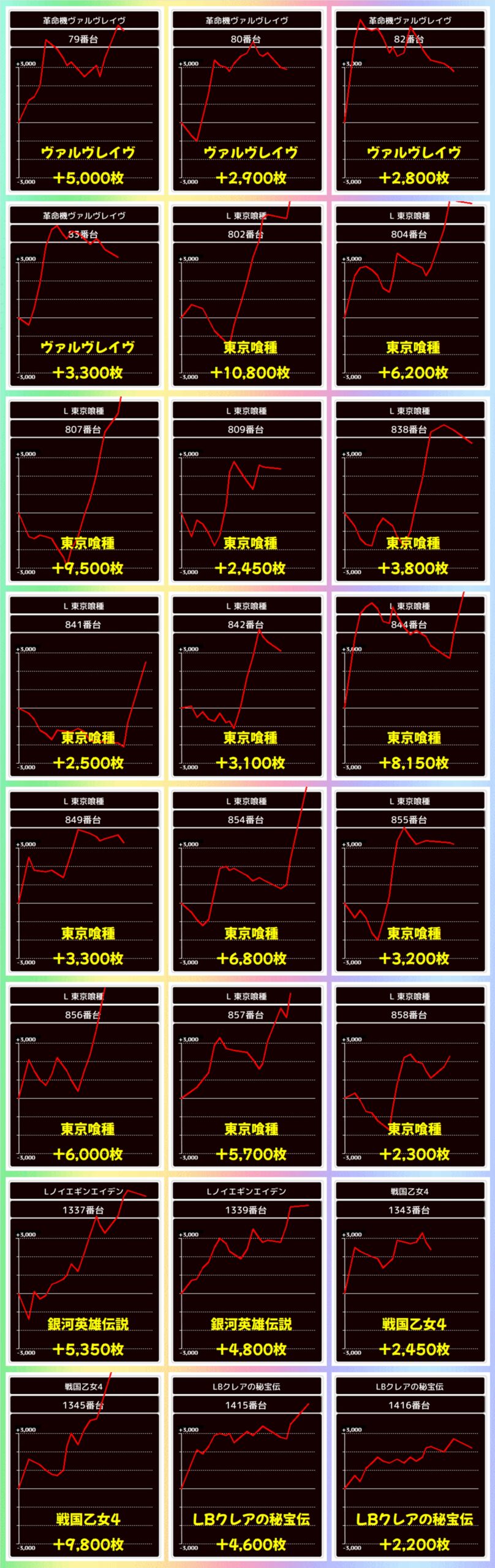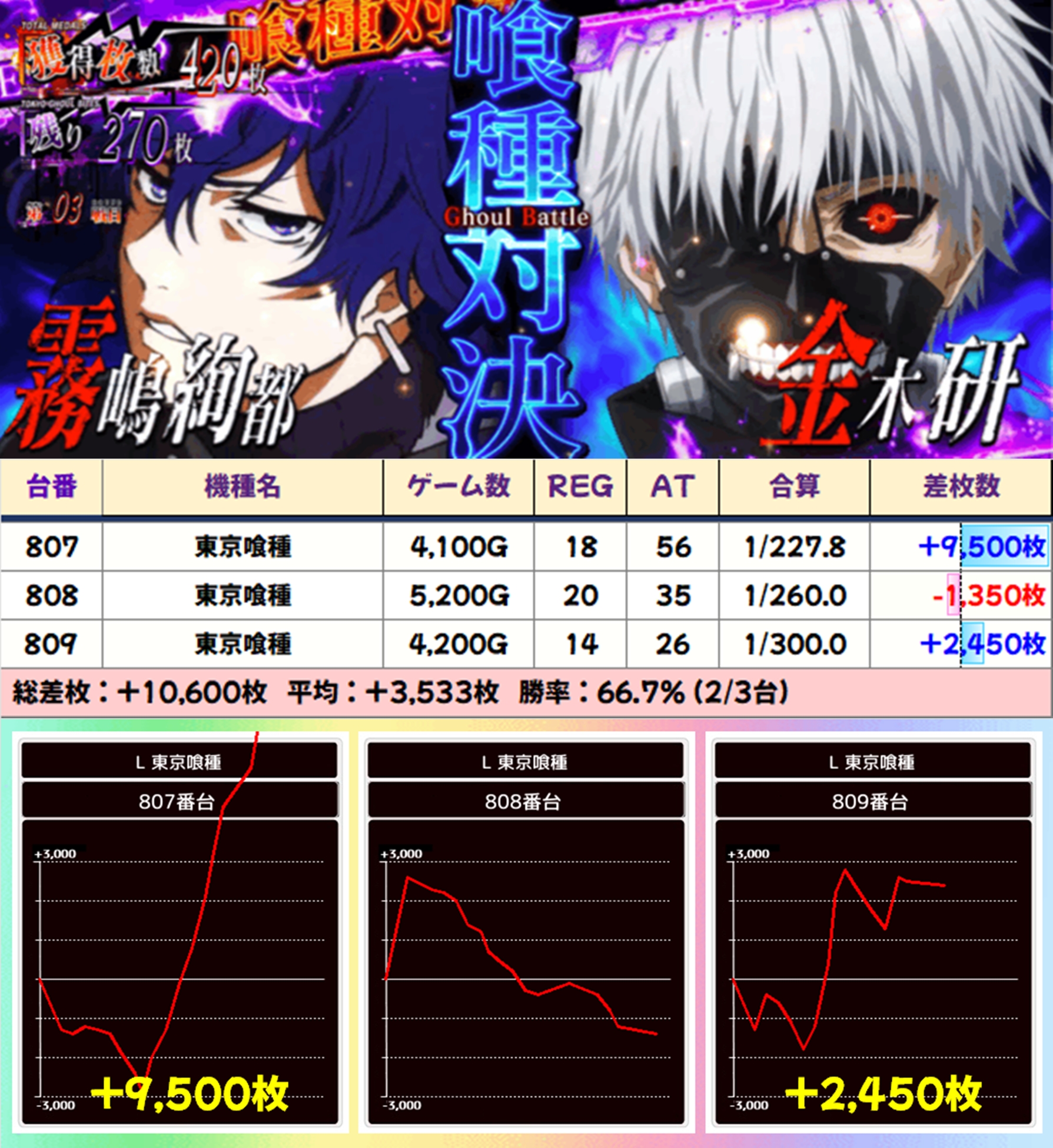 いずれの機種からも大量出玉を確認でき、東京喰種からは万枚オーバーの爆裂も出現!また、どの機種もトータルでは大幅なプラスとなっておりましたね。